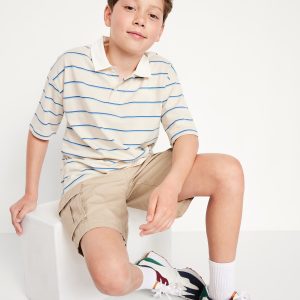 Knee Length Cargo Ripstop Shorts for Boys: interior adjustable waistband, button closure, zip fly, diagonal on-seam pockets, snap-button cargo pockets at each leg, single patch pocket at back, all-over print or solid color, #681416