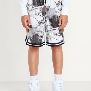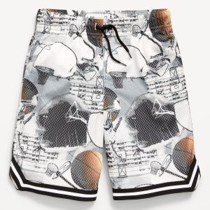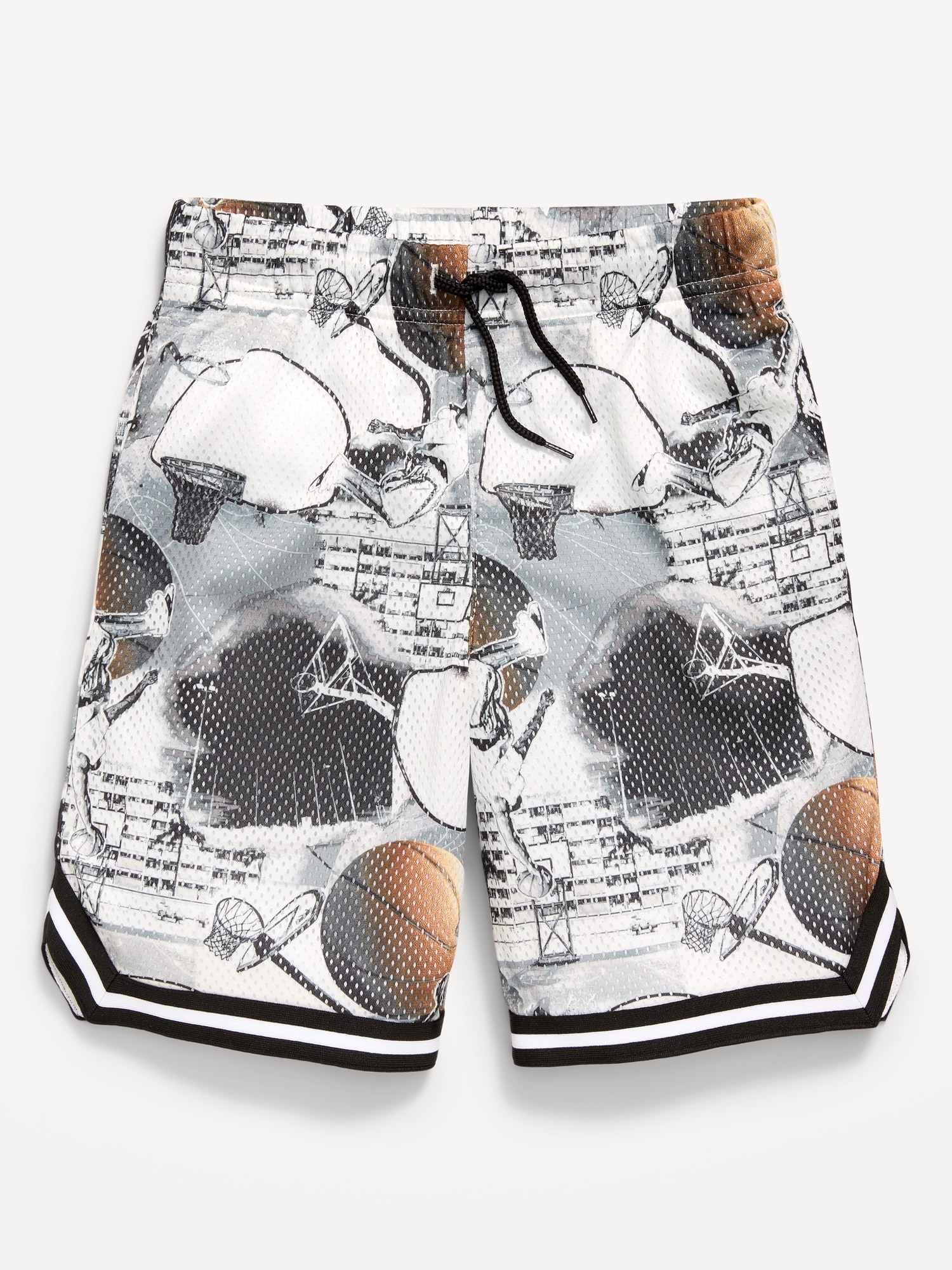 Knee Length Mesh Basketball Shorts for Boys: Made to keep up with all their shenanigans., Elasticized waistband, with adjustable drawstring., On-seam welt pockets., Retro striped tape trim at leg openings and vented sides., Breathable lightweight mesh lets him vent., Smooth, lightweight tricot lining., #875637