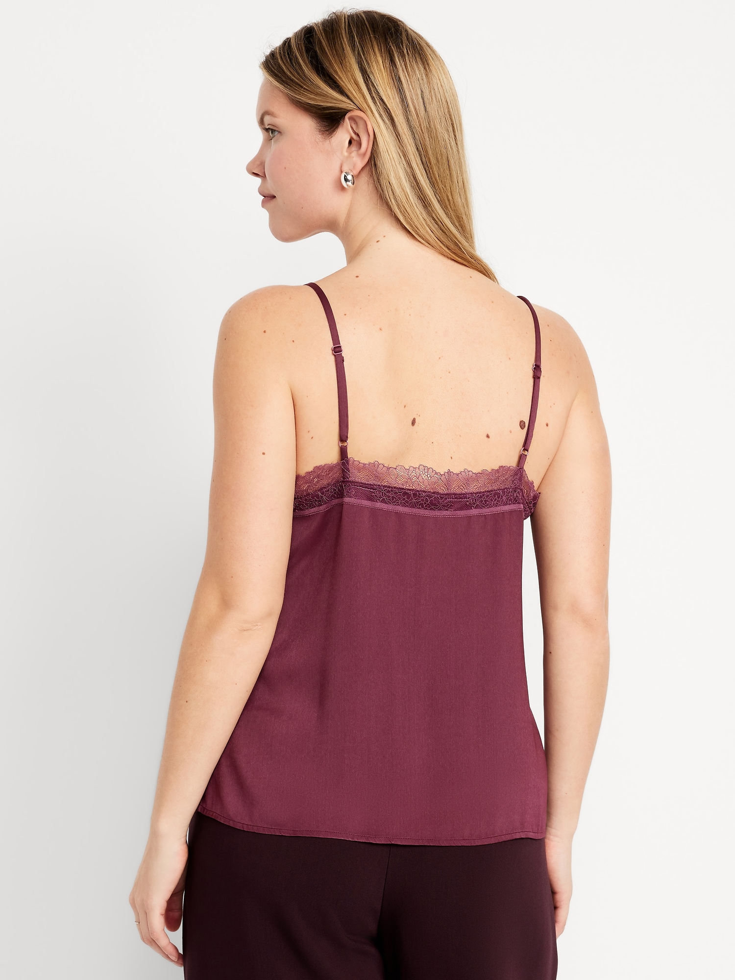 Lace-Trim Satin Cami Top: lace-trim v-neck, adjustable spaghetti straps, darted bust, #798427