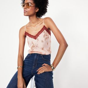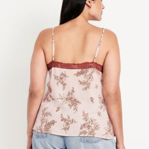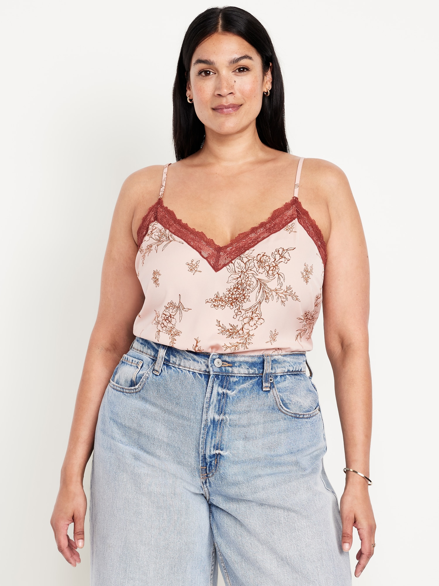 Lace-Trim Satin Cami Top: lace-trim v-neck, adjustable spaghetti straps, darted bust, #798427