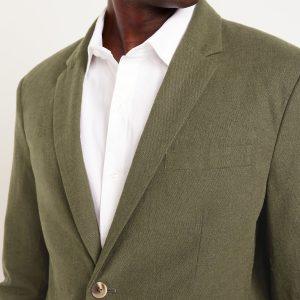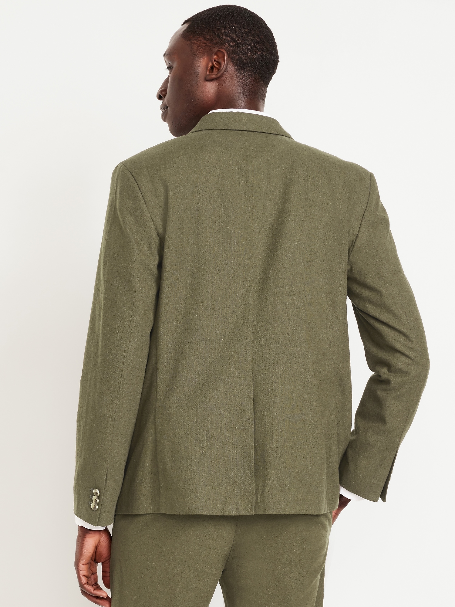 Linen-Blend Blazer: notched lapel, long sleeves, buttoned cuffs, two-button front, welt chest pocket, flap pockets, unlined, #762689