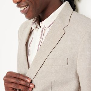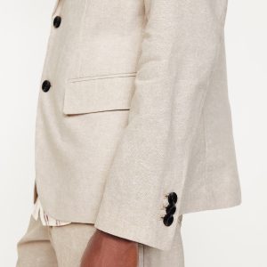 Linen-Blend Blazer: notched lapel, long sleeves, buttoned cuffs, two-button front, welt chest pocket, flap pockets, unlined, #762689