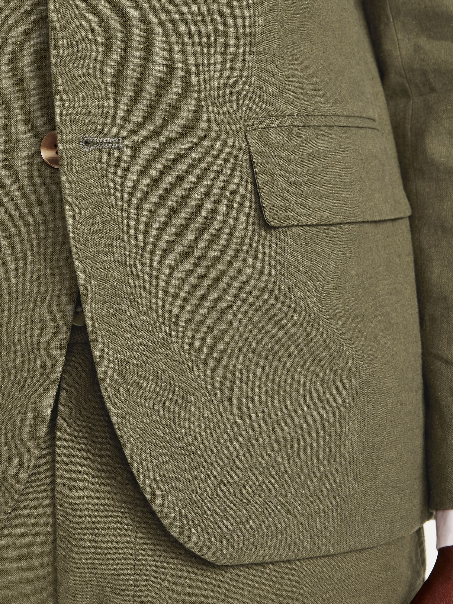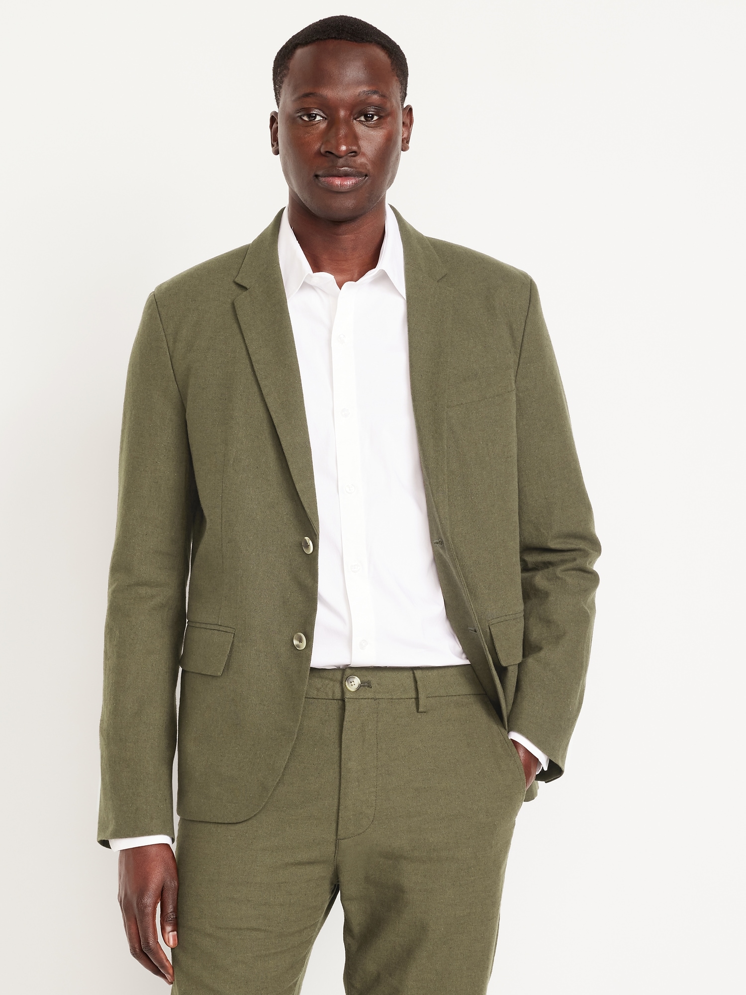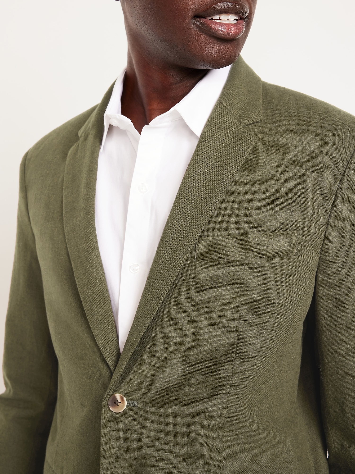 Linen-Blend Blazer: notched lapel, long sleeves, buttoned cuffs, two-button front, welt chest pocket, flap pockets, unlined, #762689