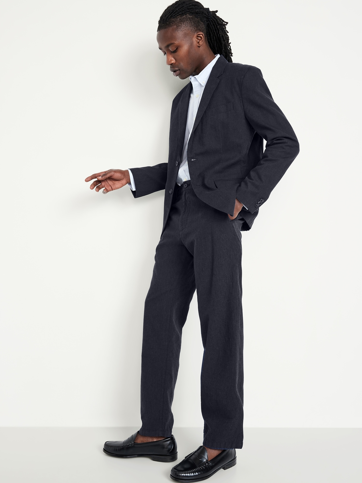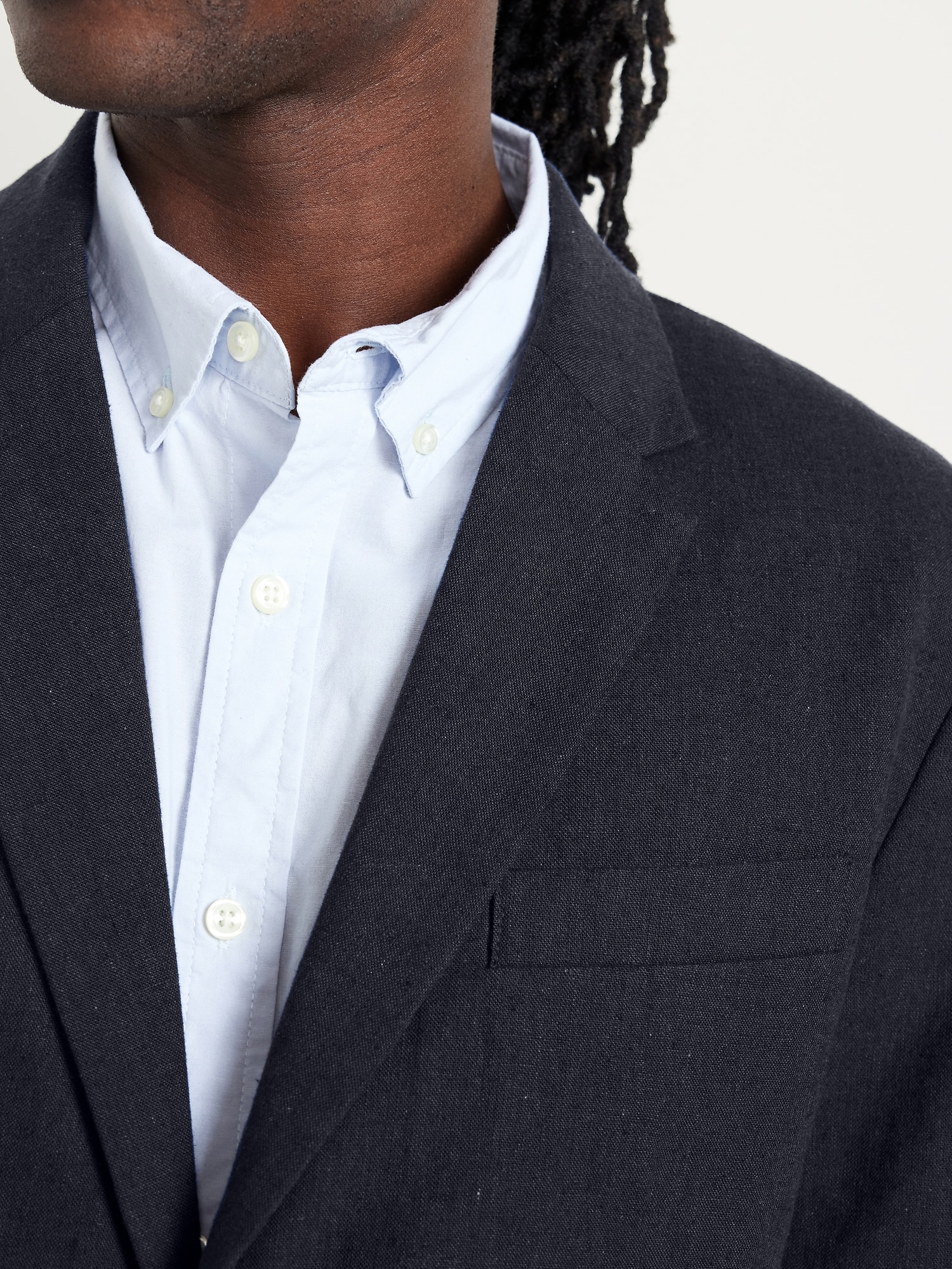 Linen-Blend Blazer: notched lapel, long sleeves, buttoned cuffs, two-button front, welt chest pocket, flap pockets, unlined, #762689