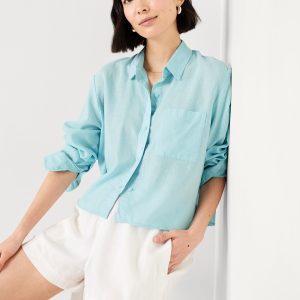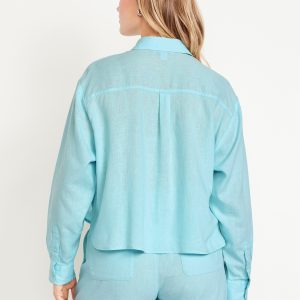 Linen-Blend Button-Down Crop Shirt: spread collar, long sleeves, buttoned cuffs, full-button front, patch chest pocket, #760758