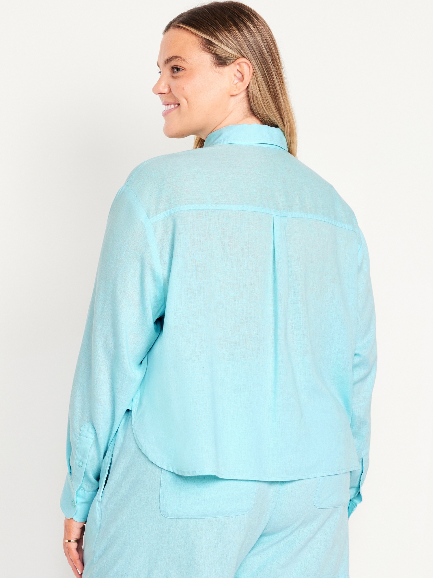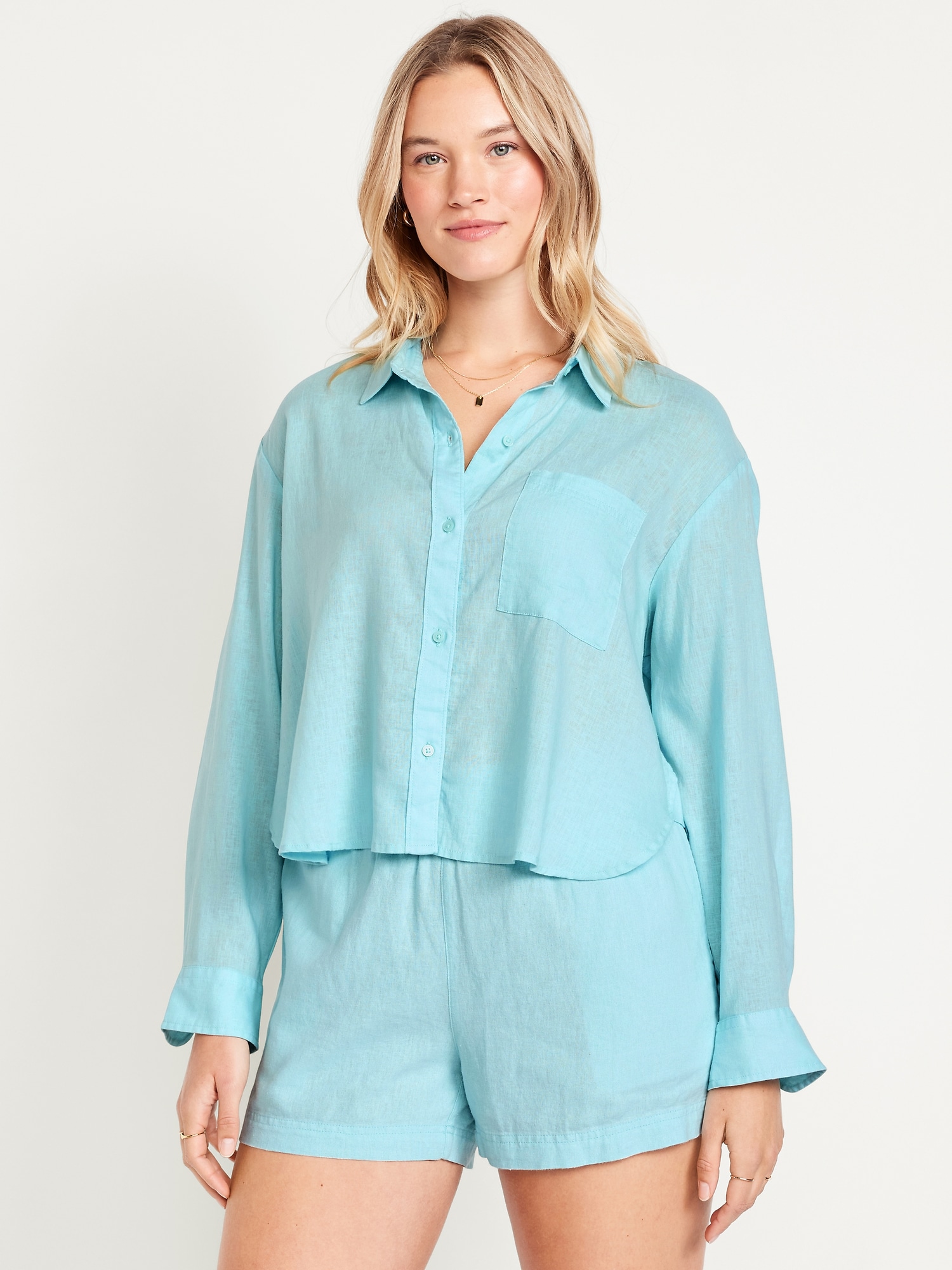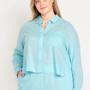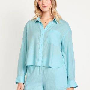 Linen-Blend Button-Down Crop Shirt
