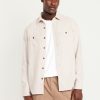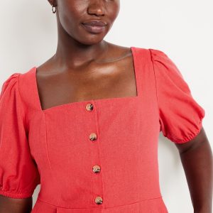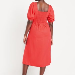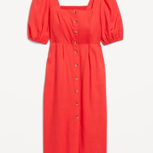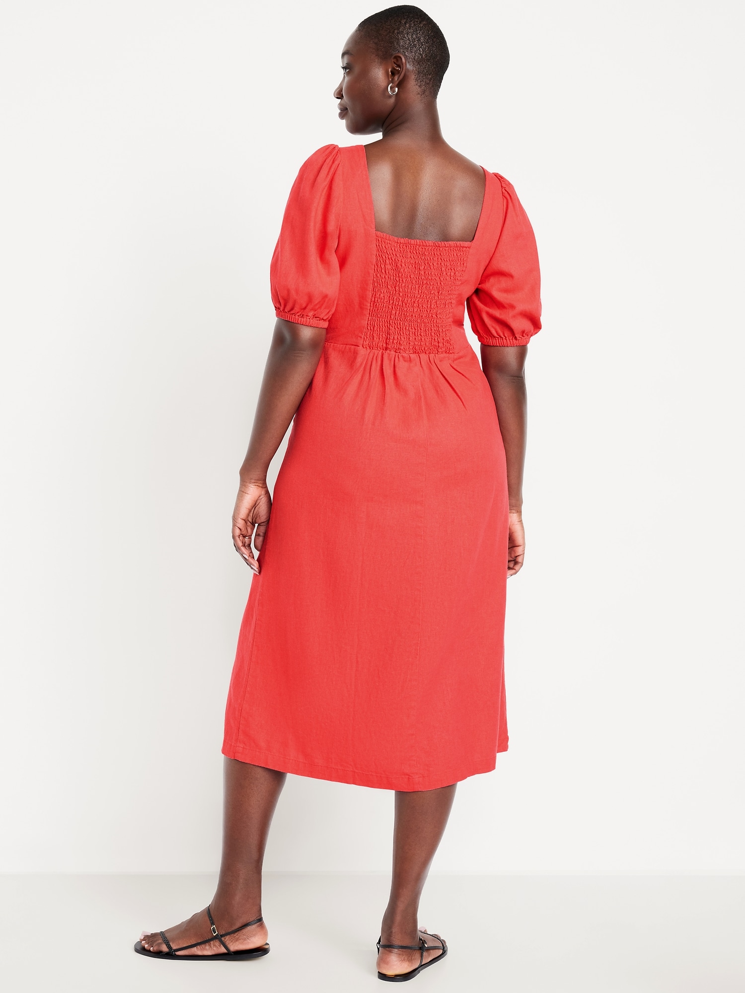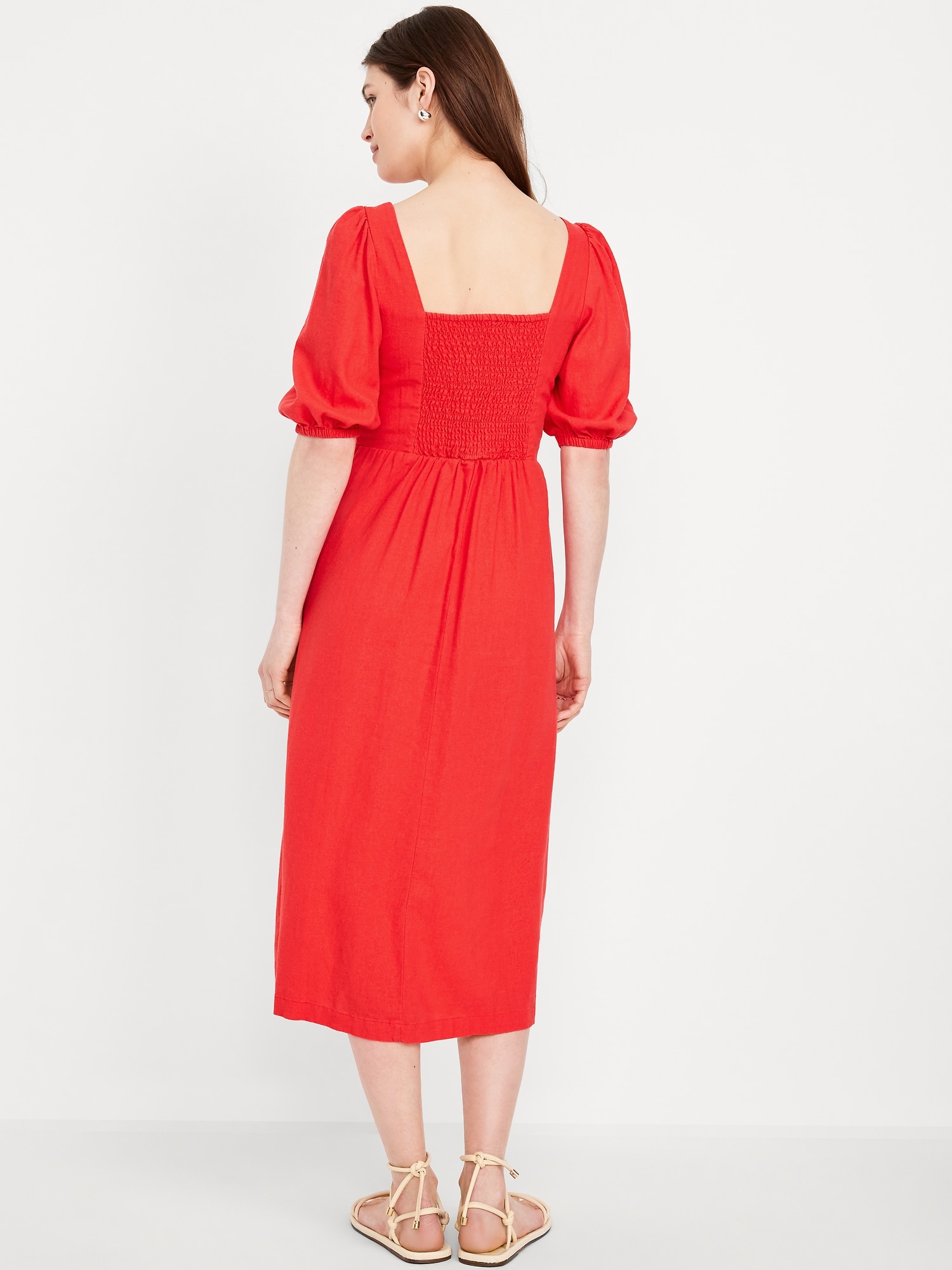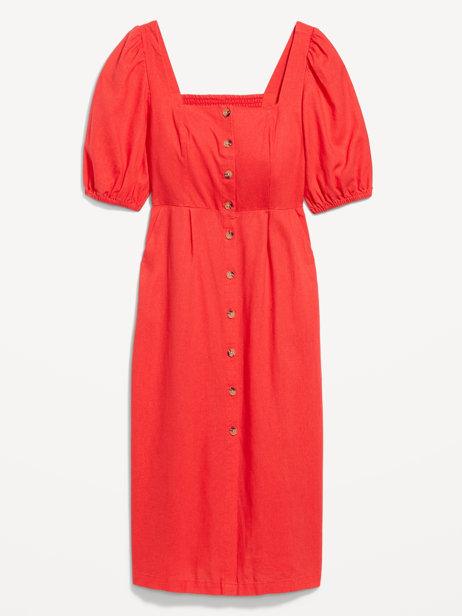 Linen-Blend Button-Front Midi Dress: square neck, short puff sleeves, full-button front, diagonal hip pockets, smocked back, #705471
