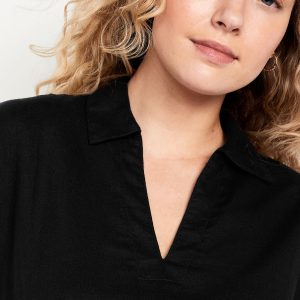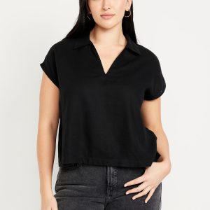 Linen-Blend Cropped Popover Shirt: spread v-neck collar, short dolman sleeves, seamed back yoke, easy popover style, #764183