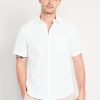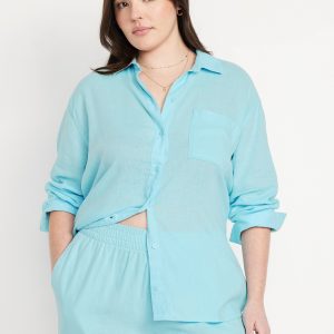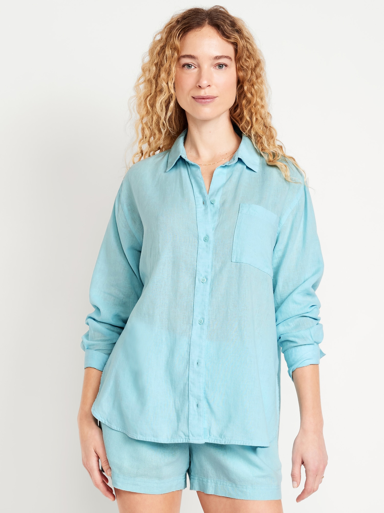 Linen-Blend Loose Button-Down Shirt: spread collar, long sleeves, buttoned cuffs, patch chest pocket, full-button front, striped print, curved hi-lo hem, #693623