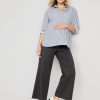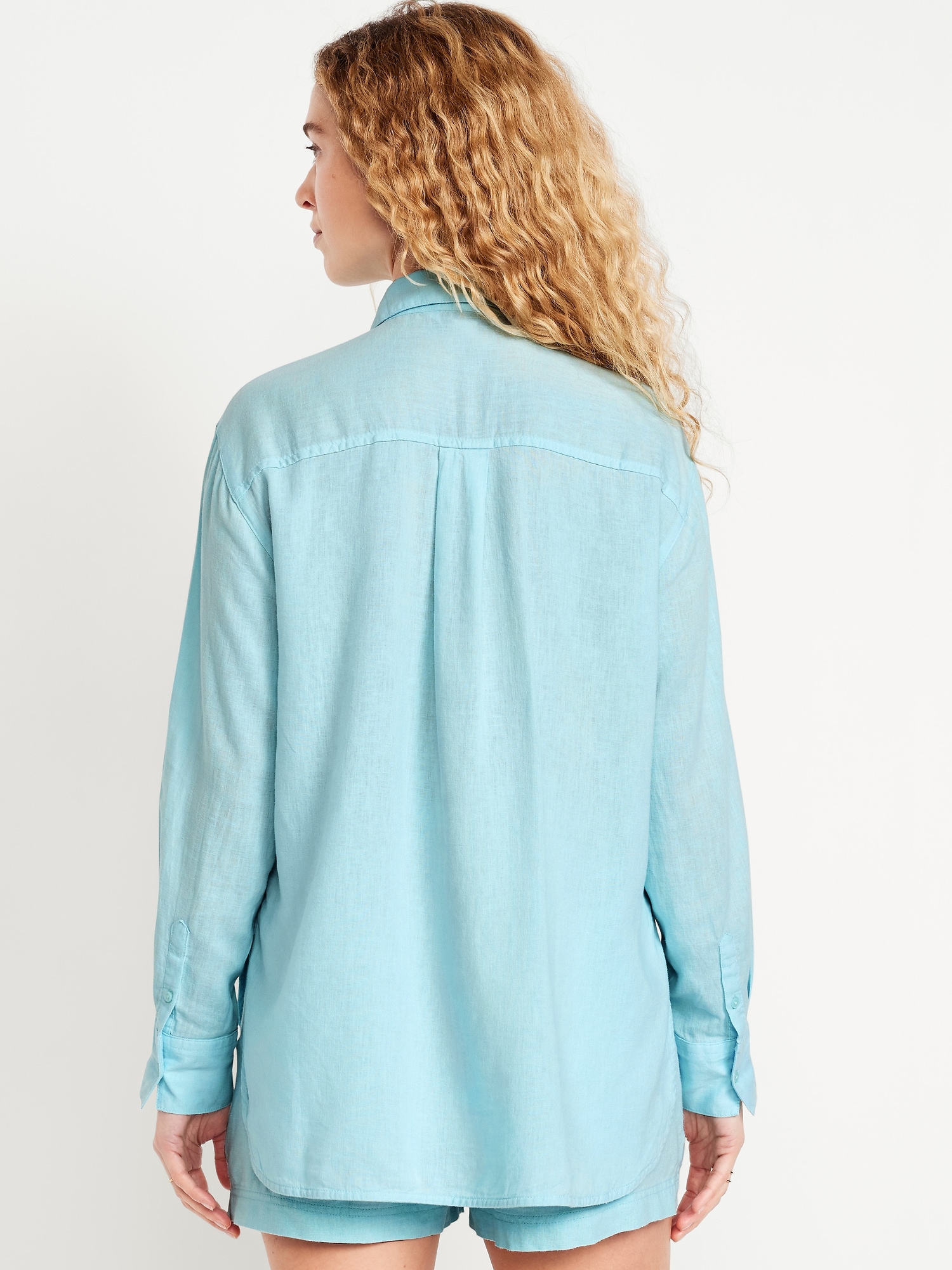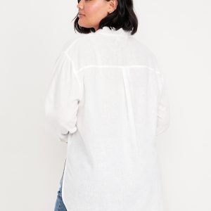 Linen-Blend Loose Button-Down Shirt: spread collar, long sleeves, buttoned cuffs, patch chest pocket, full-button front, striped print, curved hi-lo hem, #693623