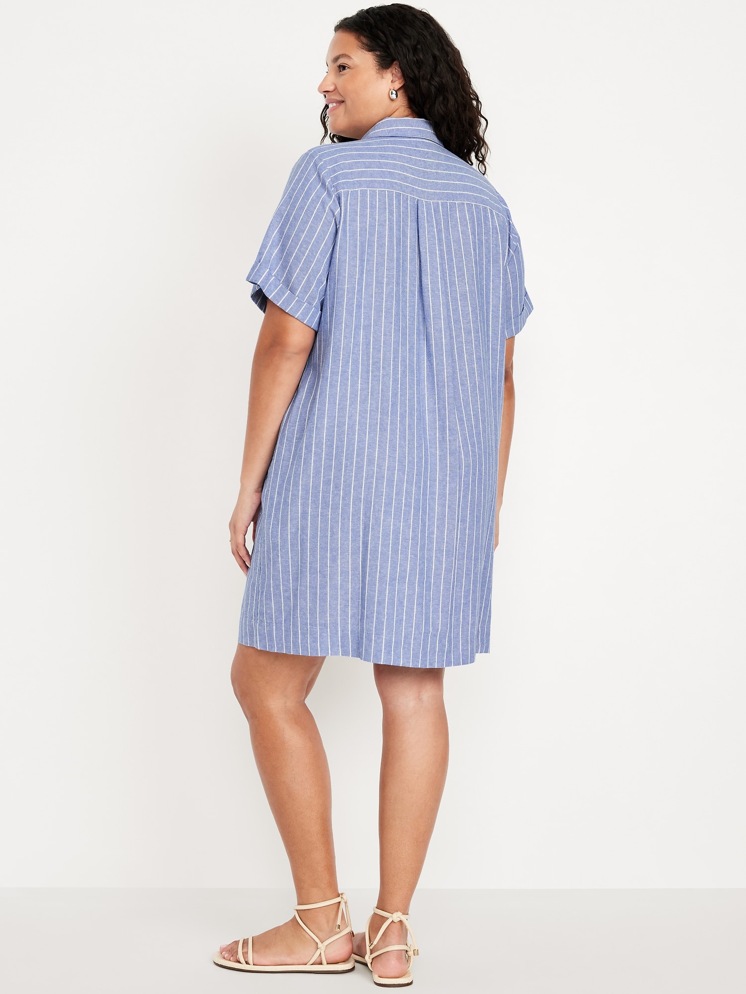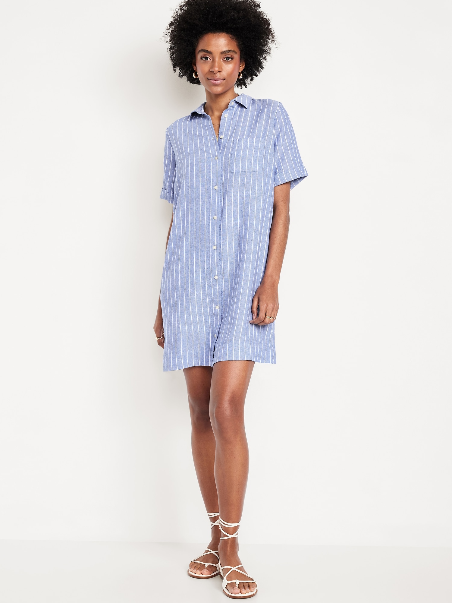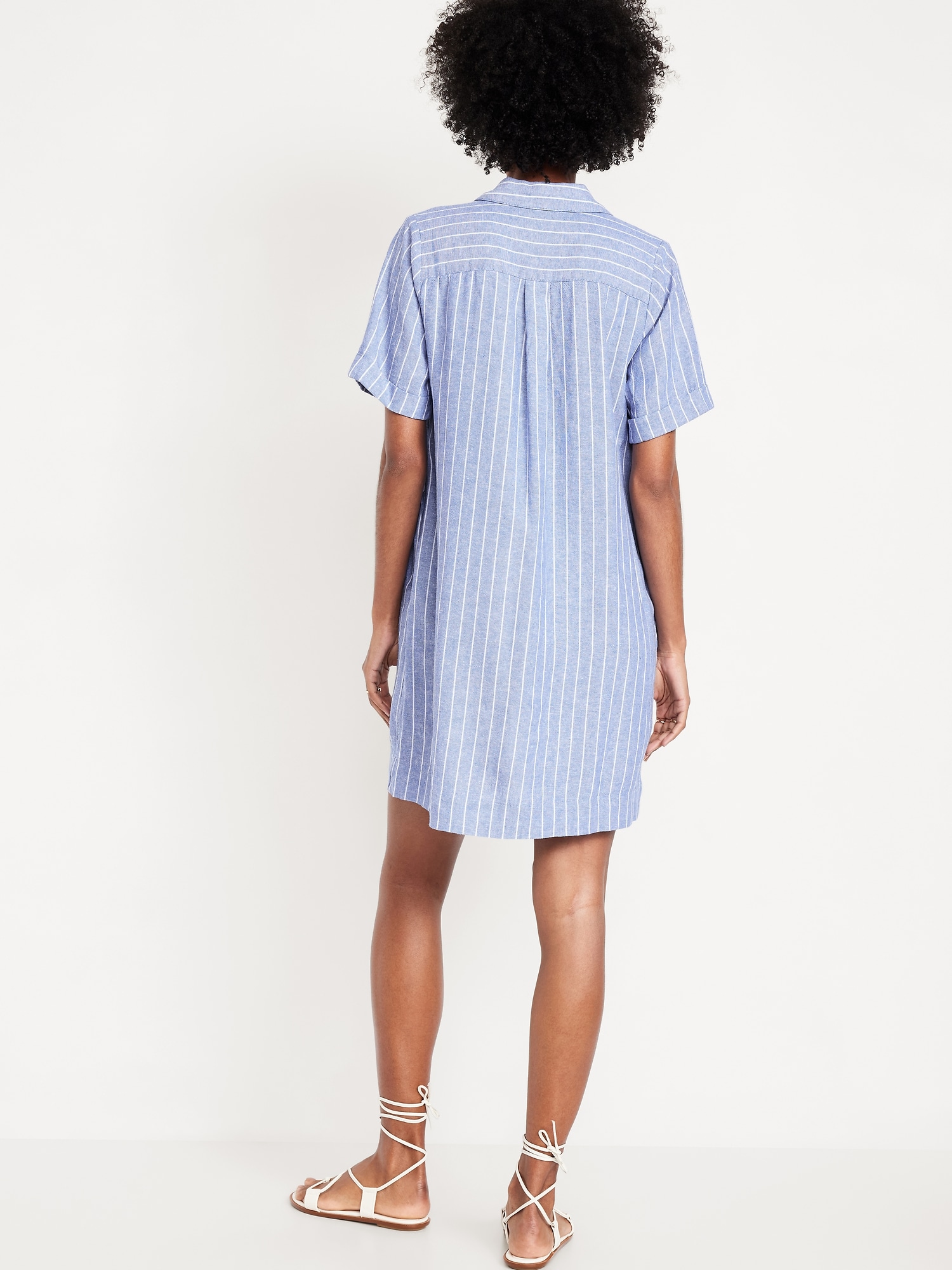 Linen-Blend Mini Shirt Dress: spread collar, short sleeves, full-button front, patch chest pocket, striped print, #766933