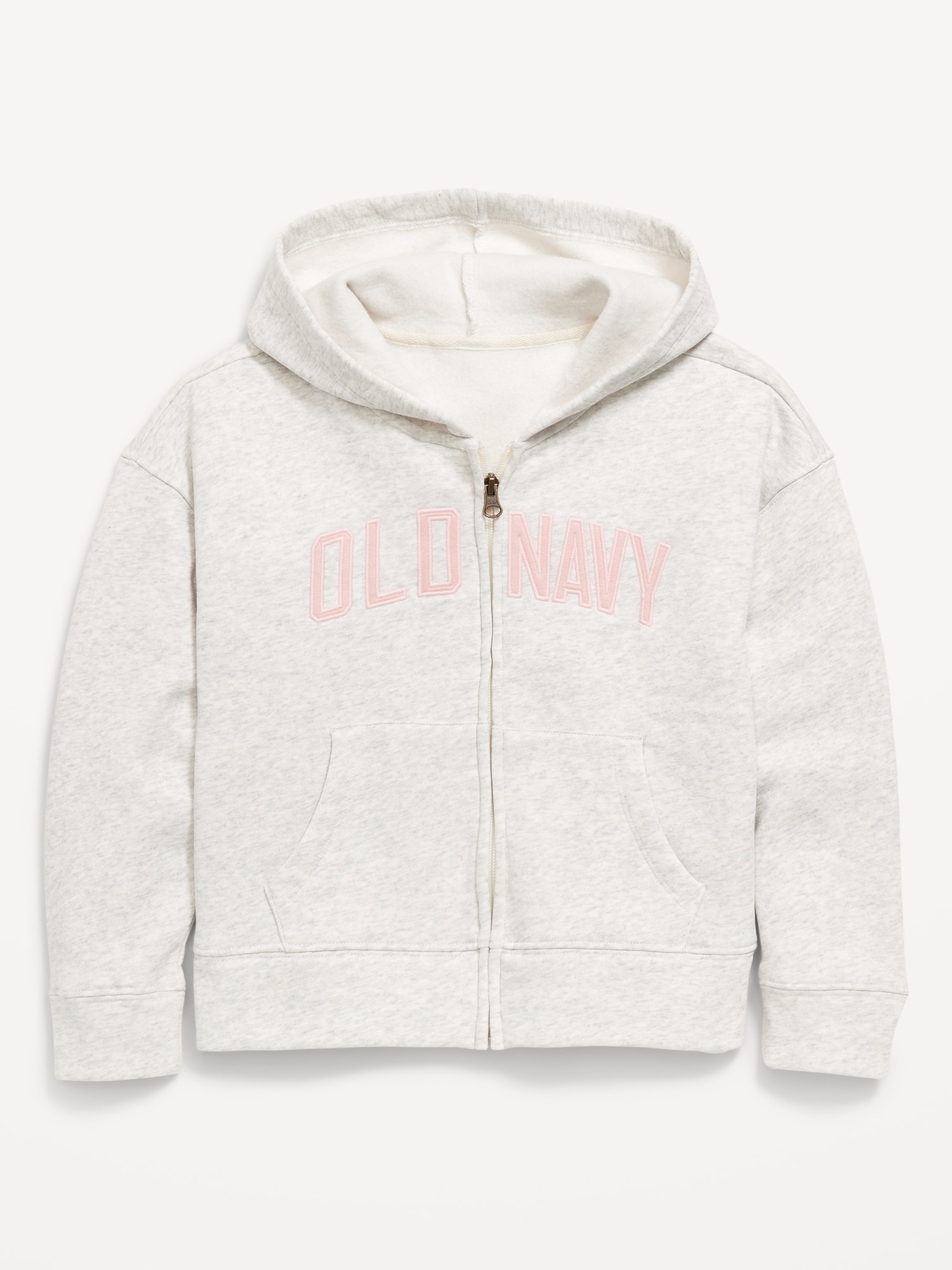 Logo-Graphic Zip Hoodie for Girls: built-in hood, long sleeves, full-length front zipper, embroidered logo graphic, banded hem, #871012