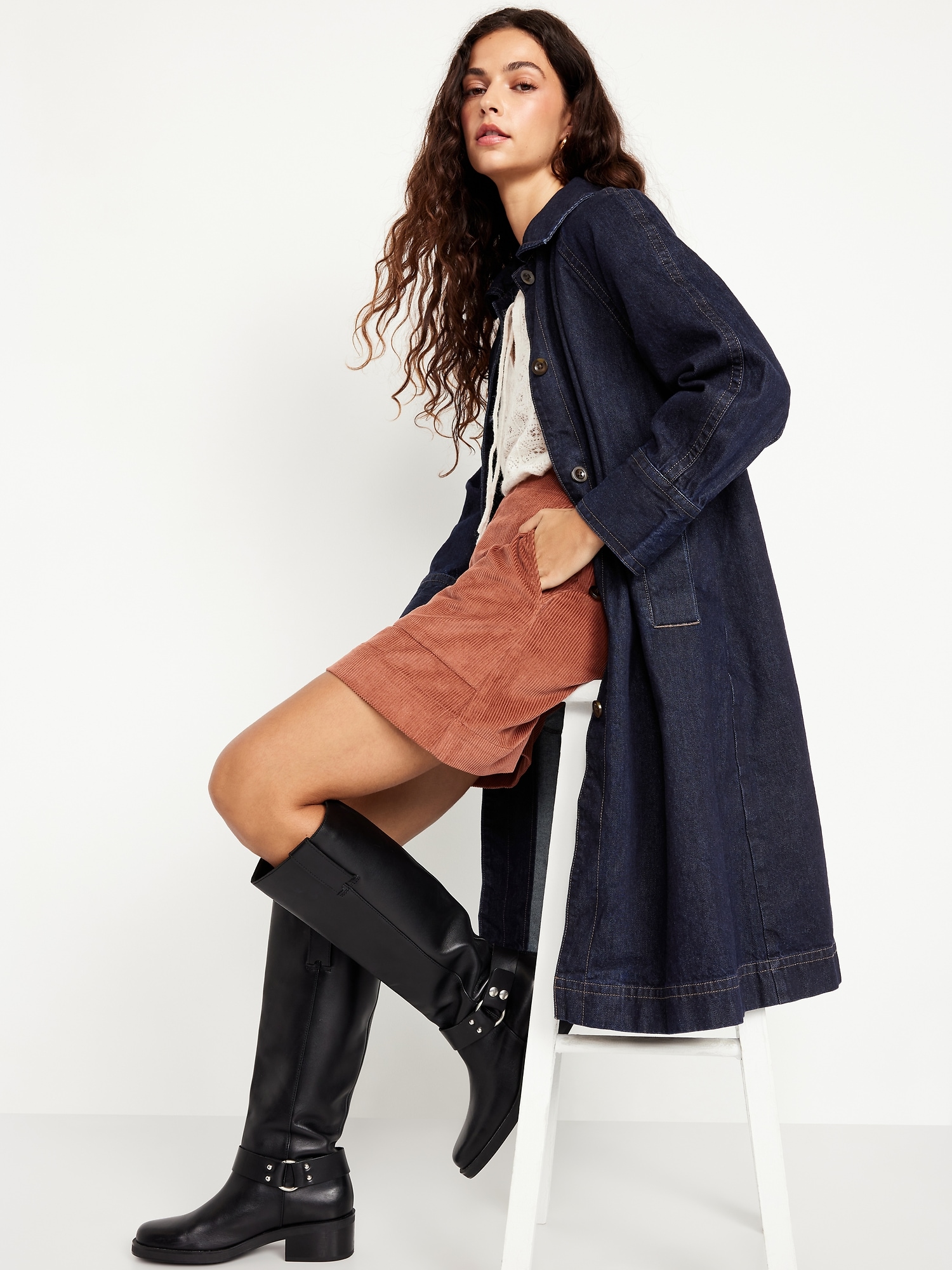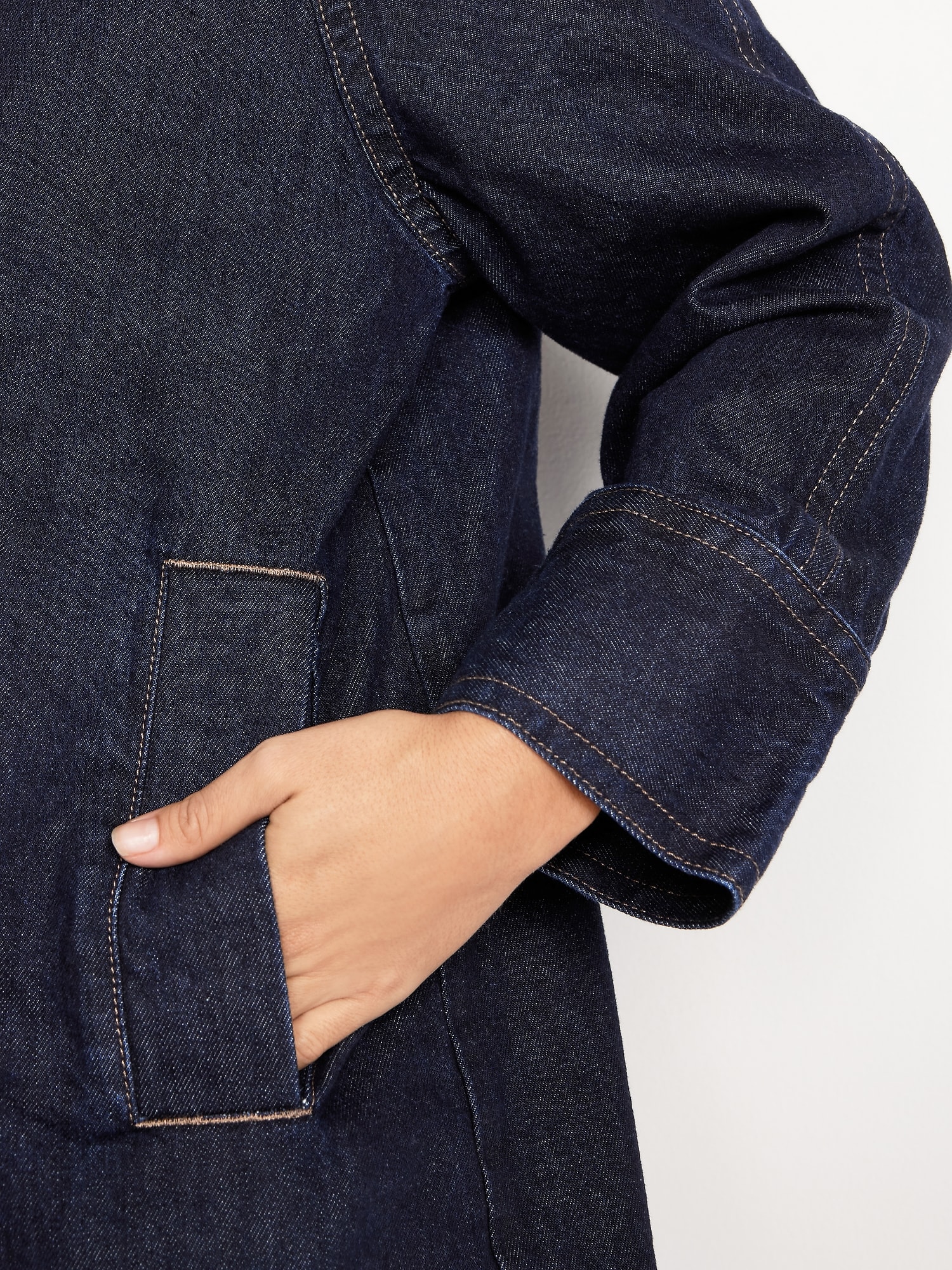 Long Denim Barn Coat: spread collar, long raglan sleeves, button front, front welt pockets, vented back hem, #790480
