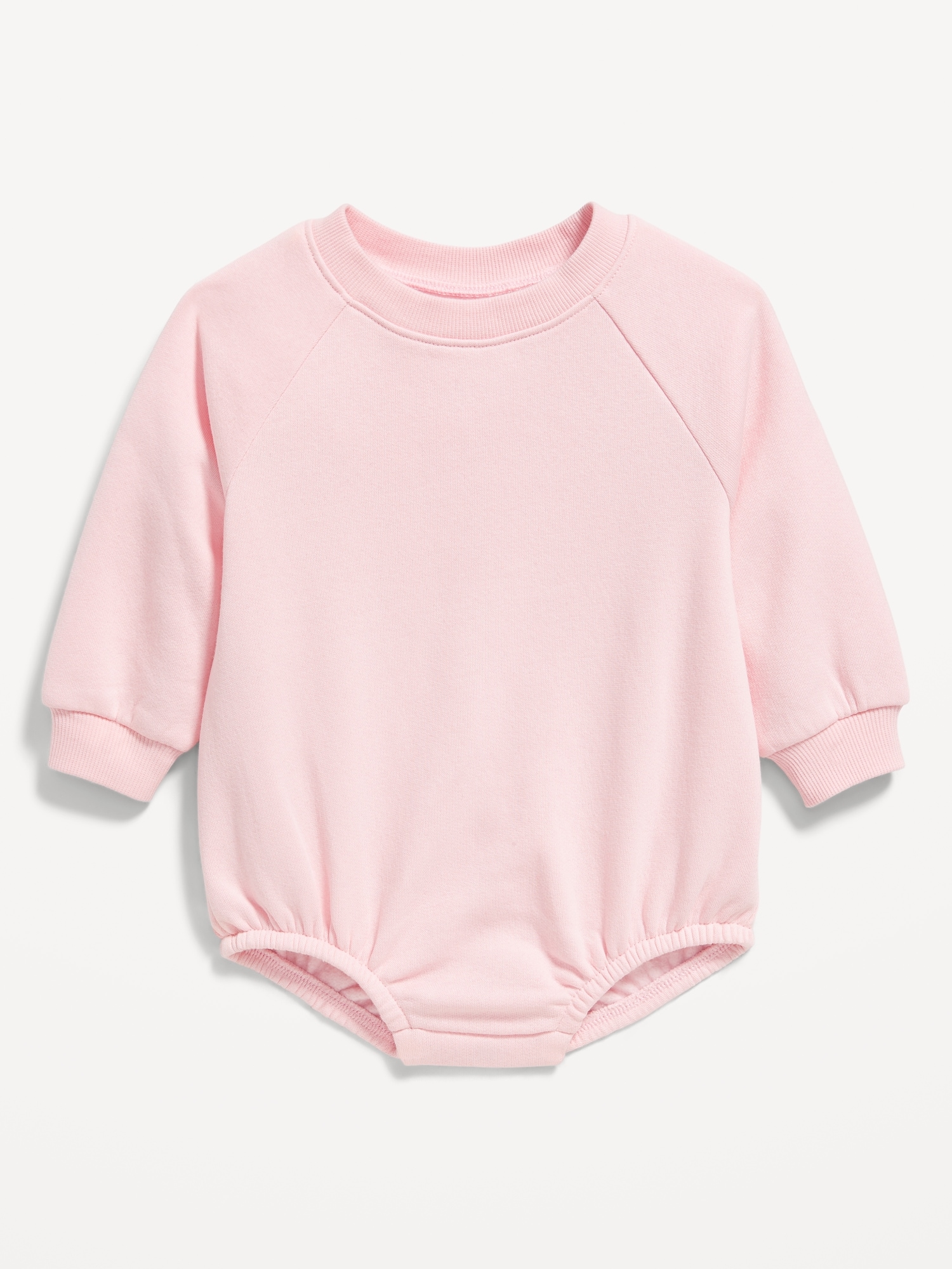 Long-Sleeve Fleece One-Piece Romper for Baby: crew neck, long raglan sleeves, elasticized bubble leg openings, hidden snaps along inseam, all-over print, #802253