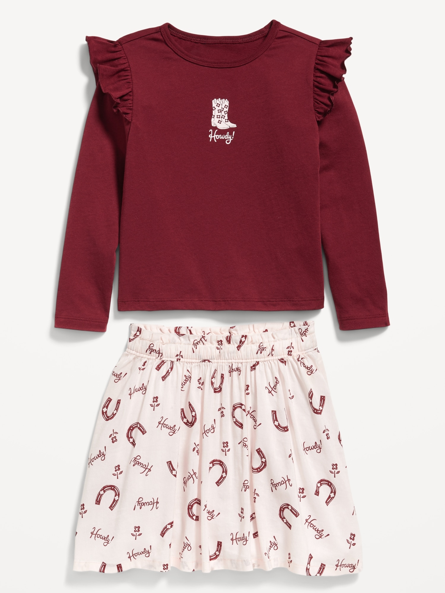 Long-Sleeve Ruffle T-Shirt and Skirt Set for Toddler Girls: Mix Match Go Productscoop neck, long sleeves, ruffle overlay along shoulders, matching skirt, elasticized waistband, all-over print, online exclusive, #805546