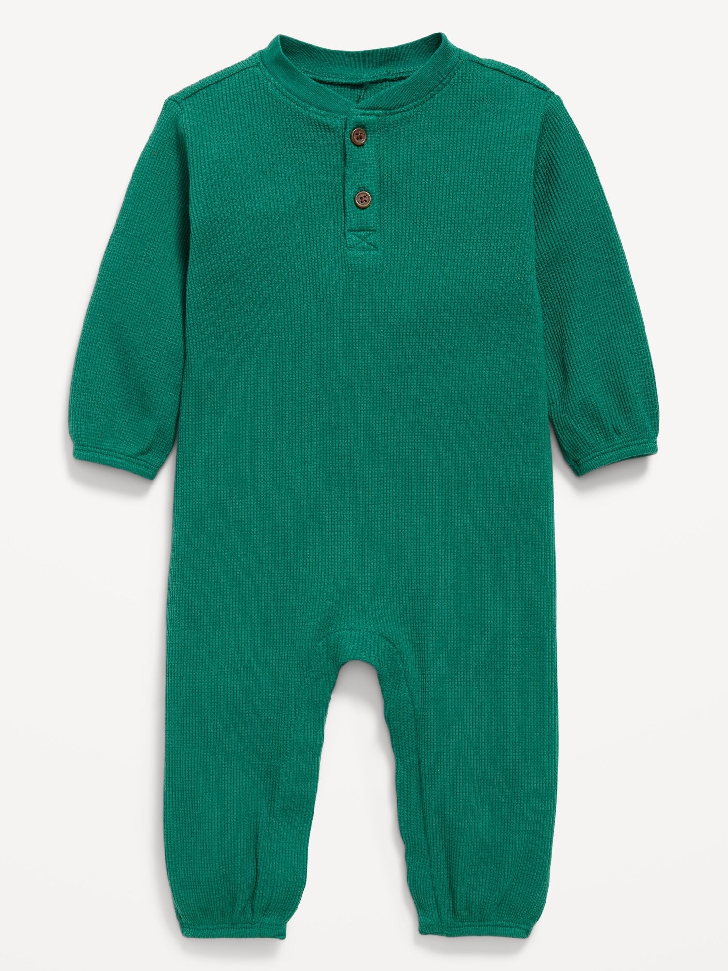 Long-Sleeve Waffle-Knit Henley One-Piece for Baby: crew neck, two-button henley placket, long sleeves, hidden snaps along inseam, #804450
