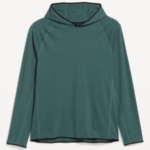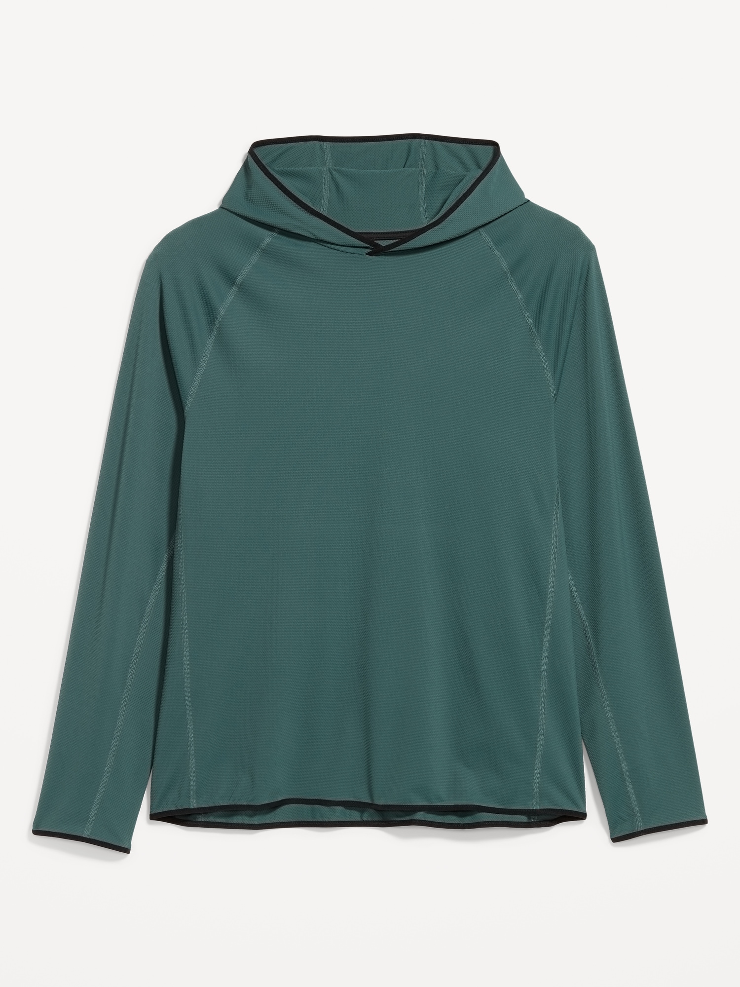 Loose Fit Pullover Run Hoodie: built-in hood, long raglan sleeves, reflective trim at center back, go-dry cool wicks moisture and keeps you cool, breathable, pullover style, #749723
