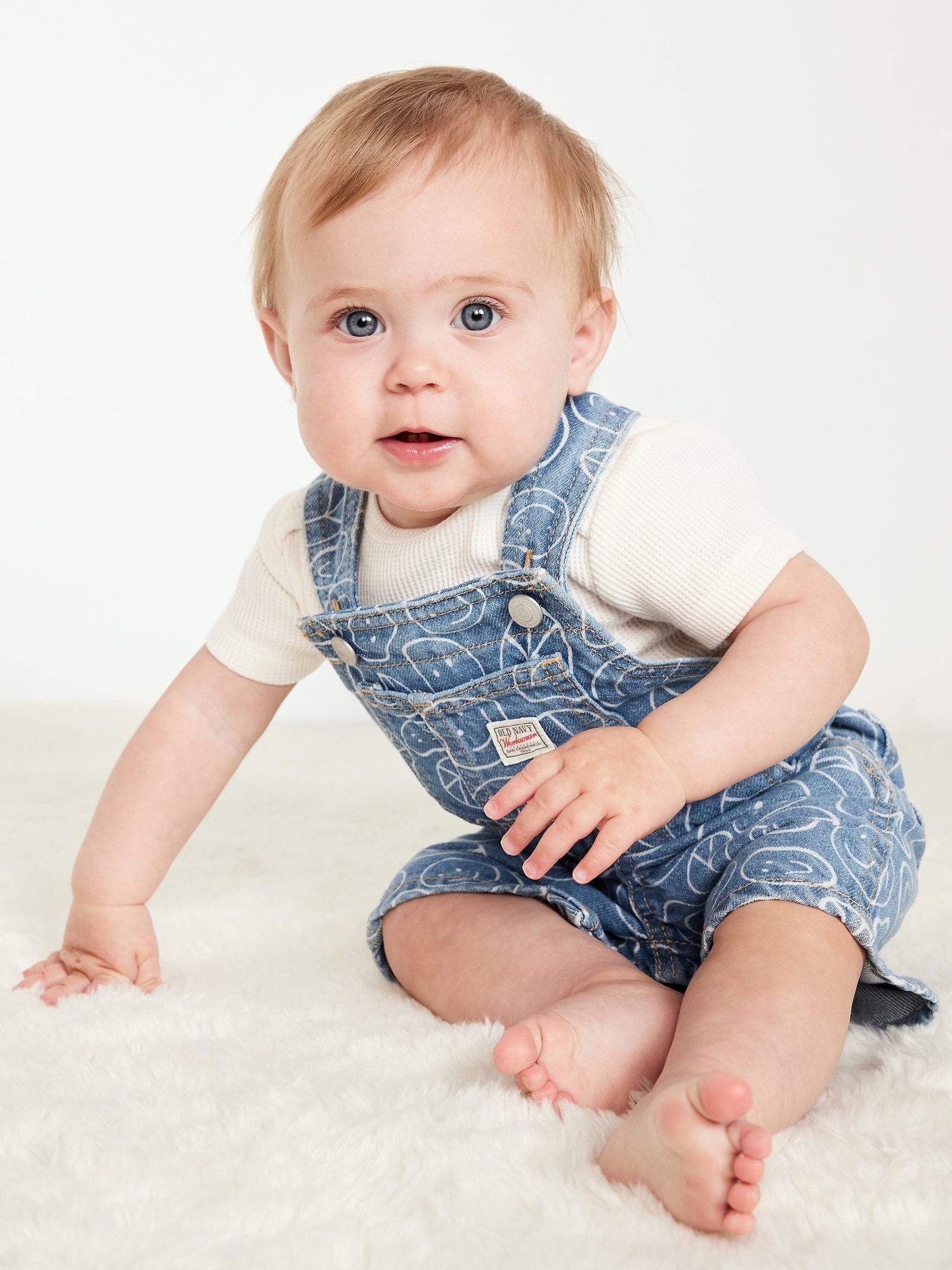 Loose Printed Jean Shortalls for Baby: wide adjustable straps, bib at front, snap-button closures at waist, ring-snaps along inseam, diagonal front pockets, patch pockets at back, all-over print, #694165
