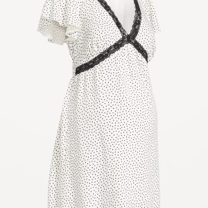 Maternity Crepe Lace-Trim Mini Dress: lace-trim v-neck, short flutter sleeves, elasticized back waist, shirred detail, seamed bodice, #775072