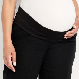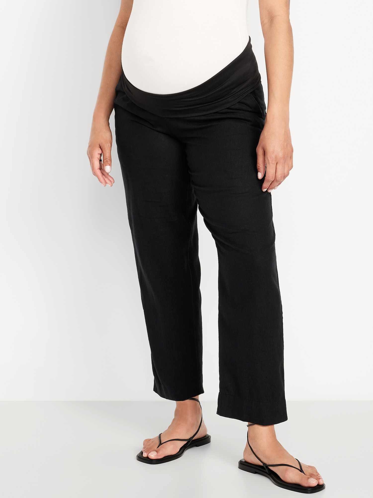 Maternity Rollover Waist Linen Pant: rollover waistband, faux fly, slit pockets at sides, patch pockets at back, #719649
