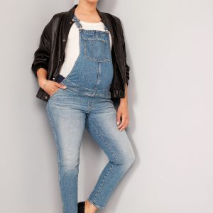 Maternity Side-Panel OG Straight Jean Overalls: Our OG Straight Jean Overalls? Think “mom jeans”…if your mom was a supermodel. Part ‘90s nostalgia, part new-normal comfort, served straight up 😎, Adjustable shoulder straps and metal button fastenings; Patch pocket at bib yoke., Banded waist, with built-in belt loops and discreet elastic side panels at the hips., Faux fly, with fading and whiskering to create a vintage, lived-in look., Soft, durable medium-wash cotton denim, with comfortable stretch., Never-Quit Shape Retention holds its shape and hugs in all the right places, wear after wear., These overalls are made with 5% recycled cotton. Less waste in the world 🌎, #759165