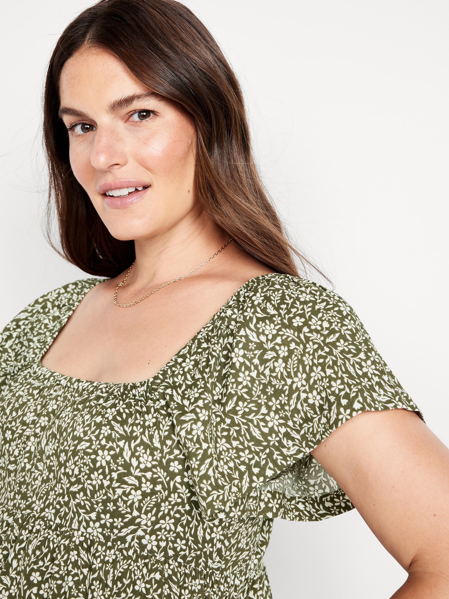 Maternity Square-Neck Mini Dress: square neck, short flutter sleeves, tiered shirred seams, all-over floral print, #826484