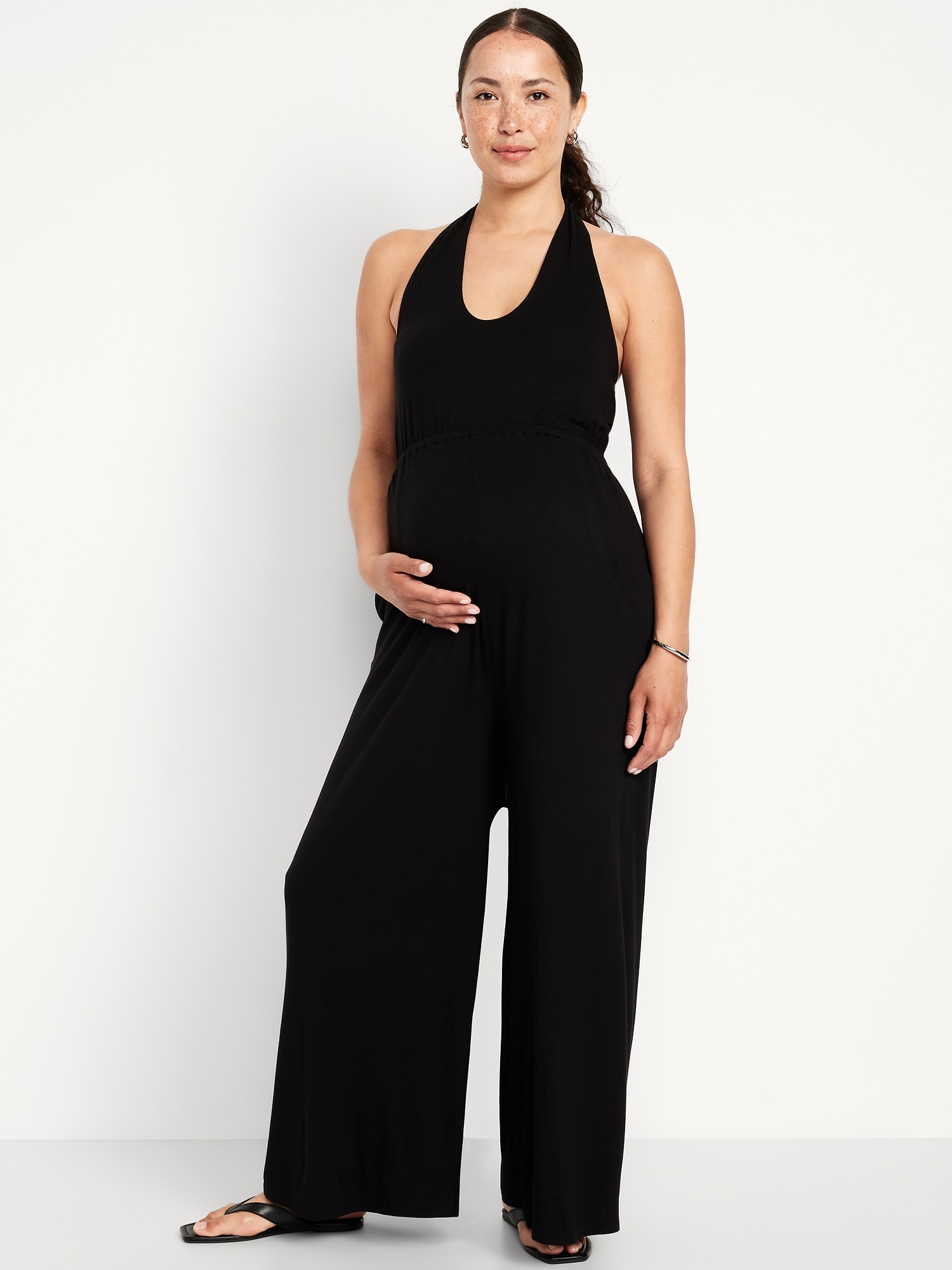 Maternity Waist-Defined Halter Jumpsuit: perfect for baby shower, tie-back halter neck, sleeveless, elastic waistband, on-seam pockets, wide leg, #719575