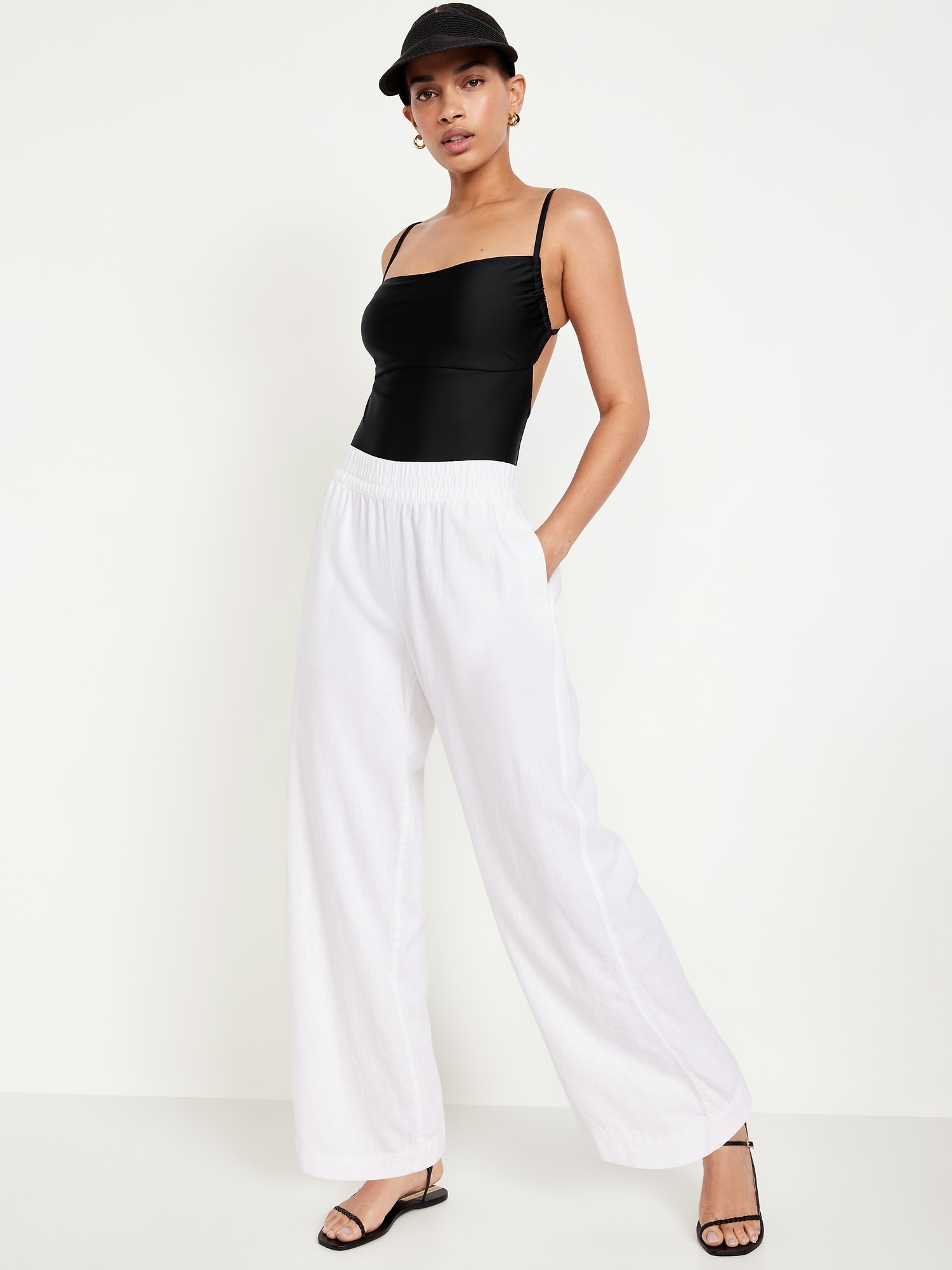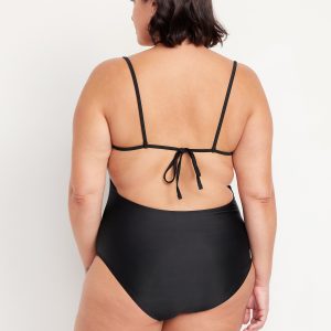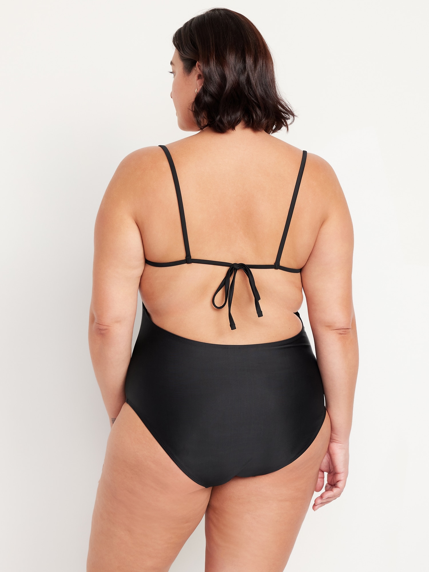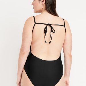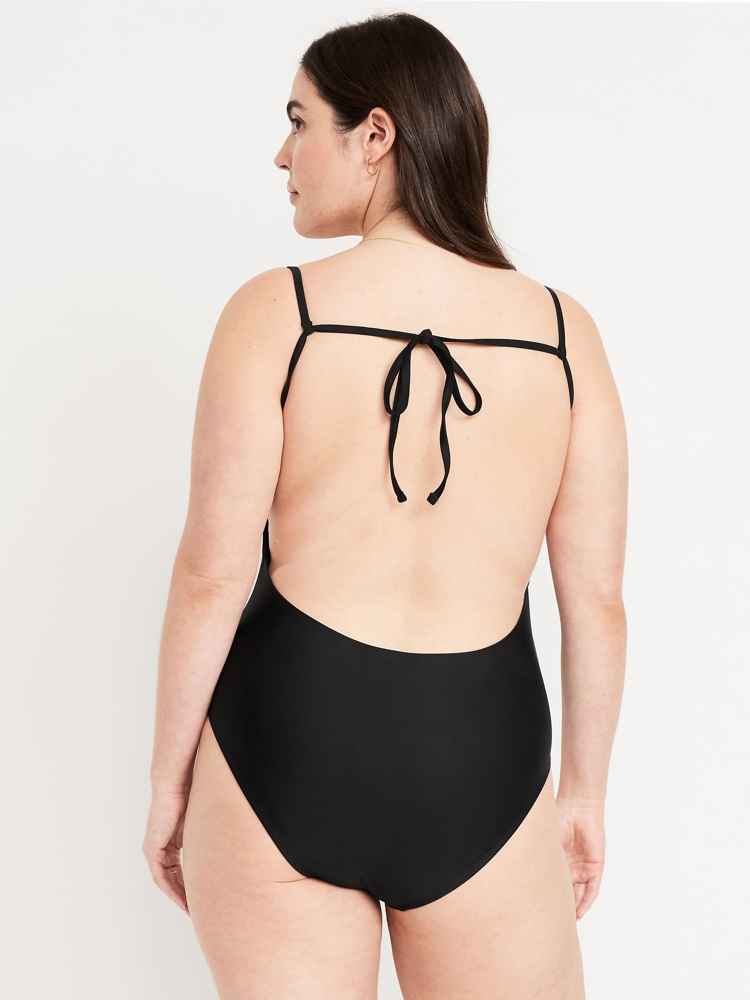 Matte Cutout Back One-Piece Swimsuit: spaghetti straps, ruched bodice, shelf bra, removable pads, cutout back, tie-back closure, elastic leg openings, #660611