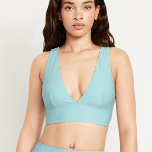 Matte Longline Bikini Swim Top: plunging v-neck, wide straps, removable pads, elastic-banded hem, #865325