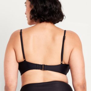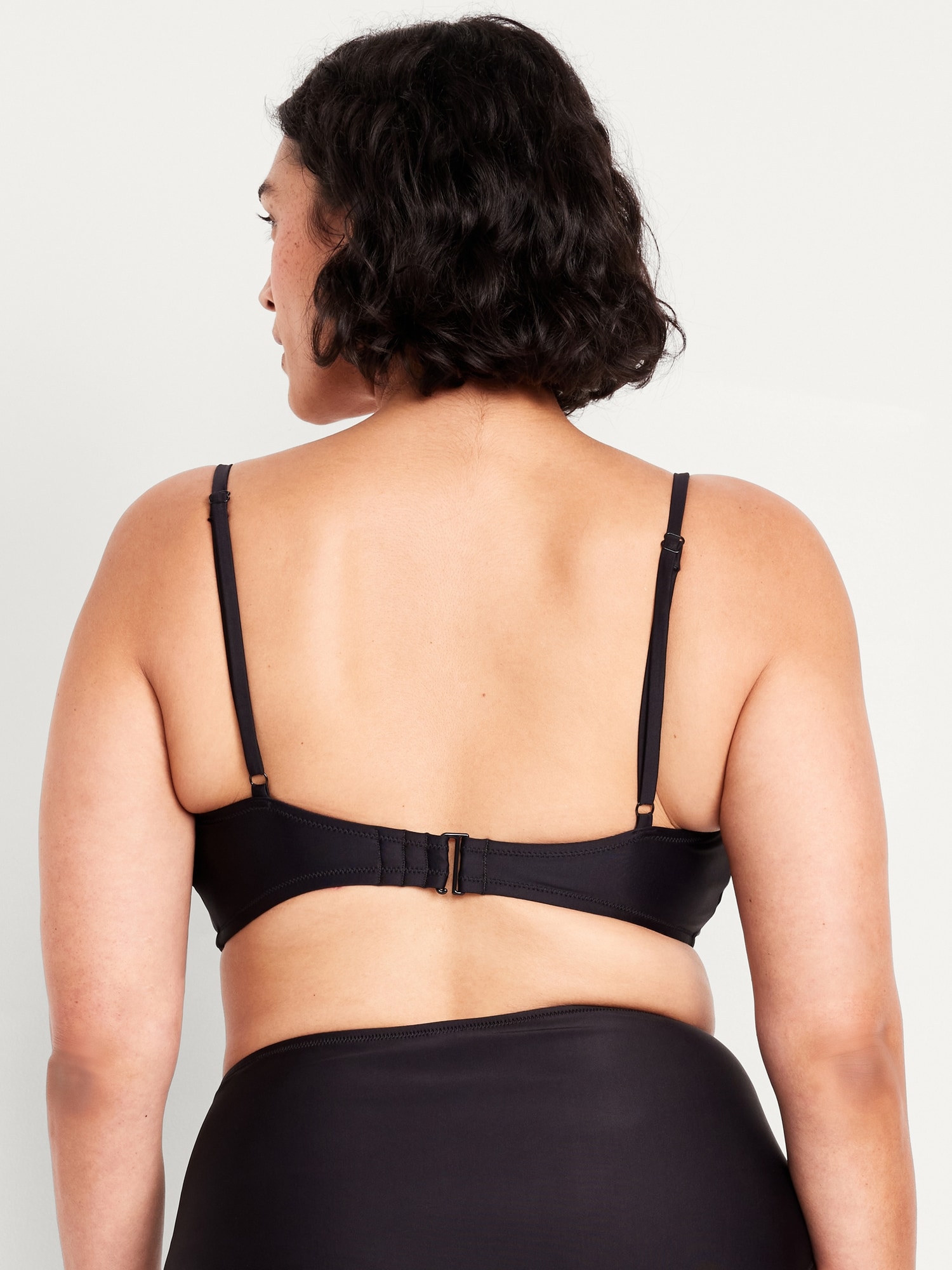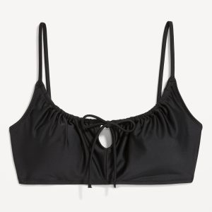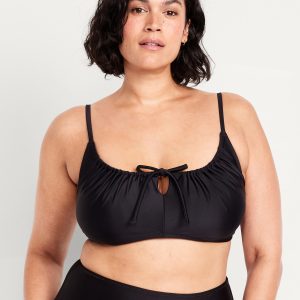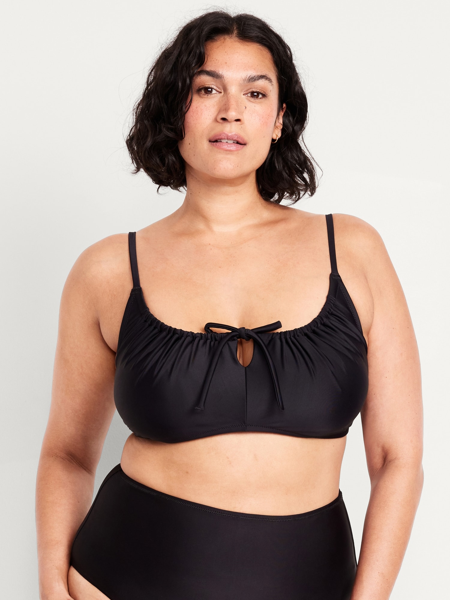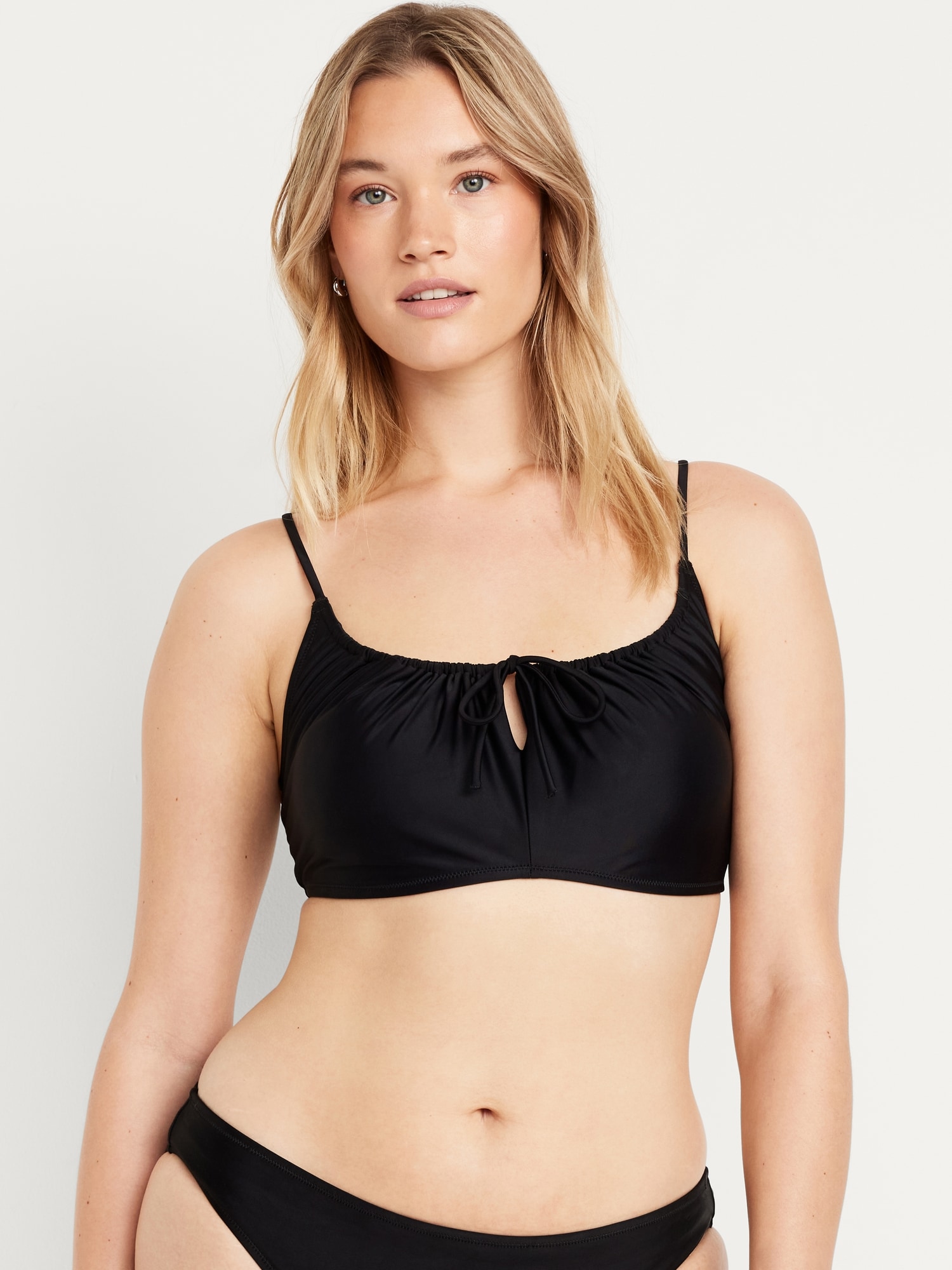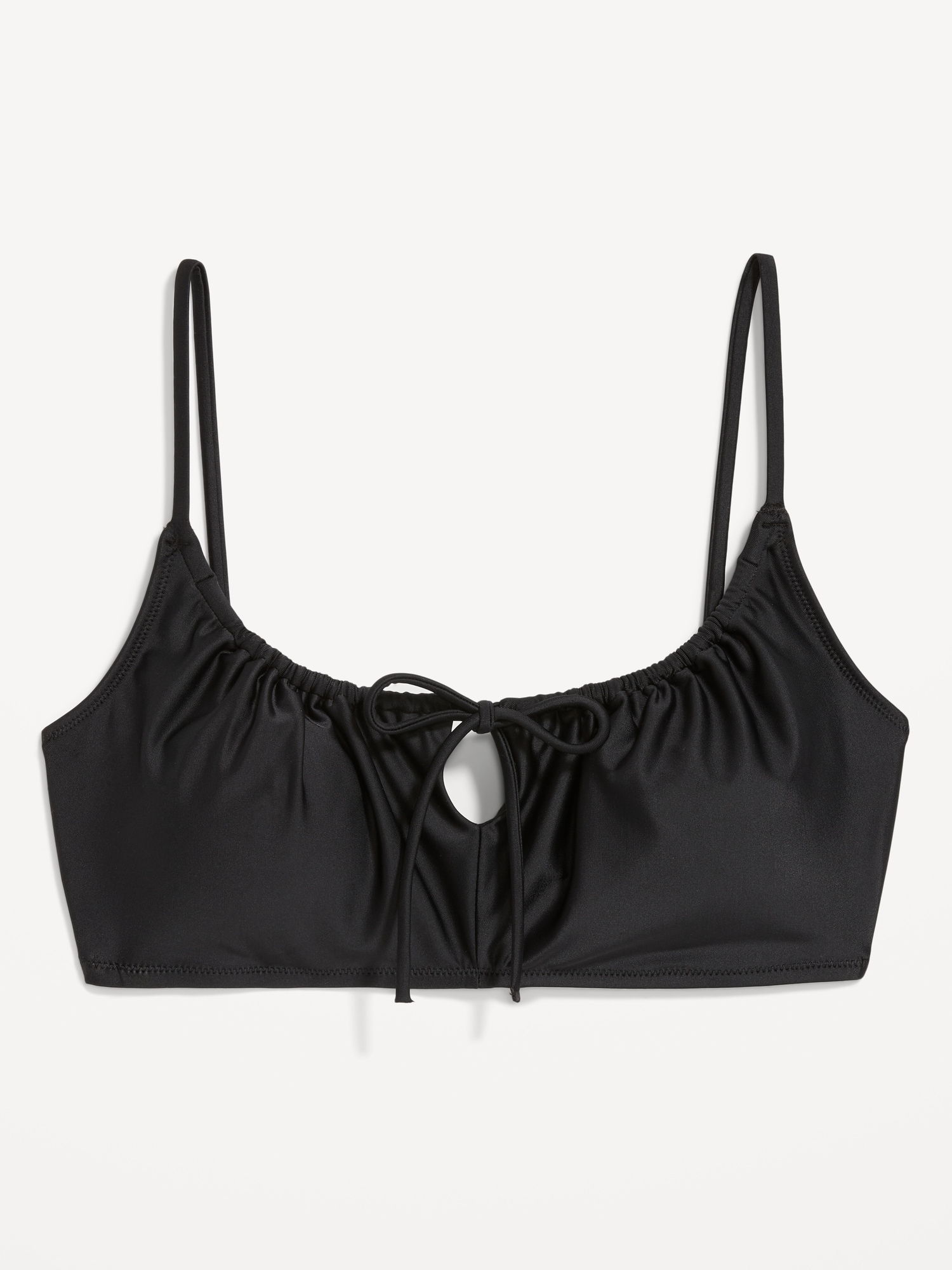 Matte Ruched Bikini Swim Top: adjustable spaghetti straps, scoop neck, tie-front keyhole accent, ruched bodice, removable pads, back clasp, gingham print, #685285