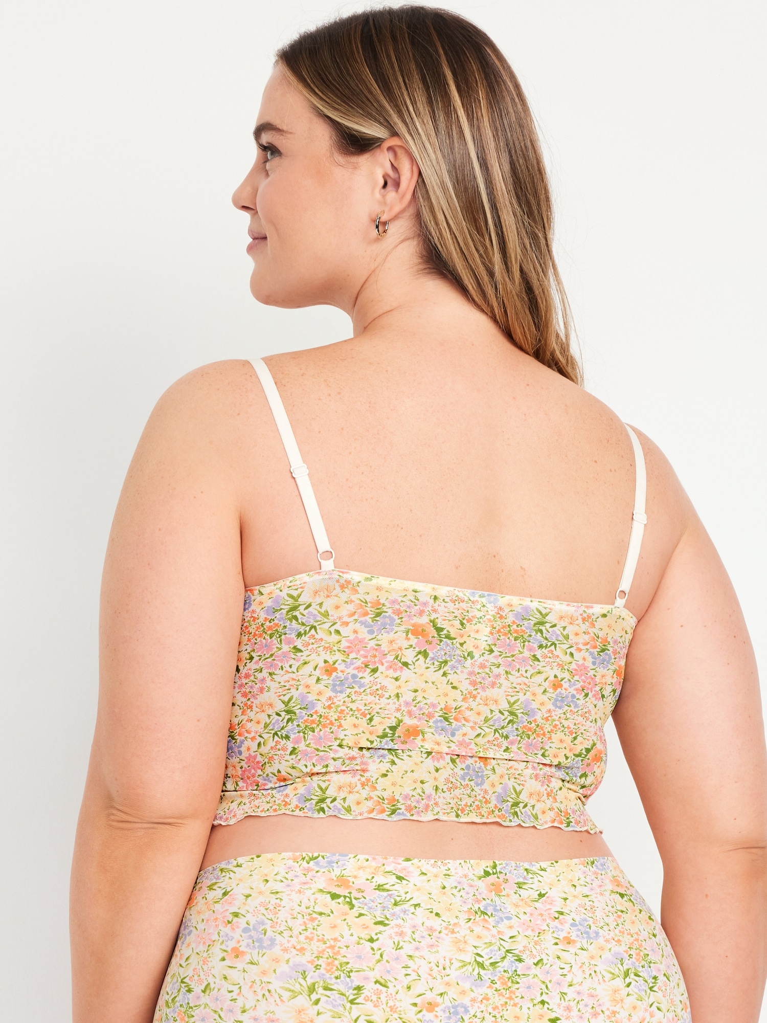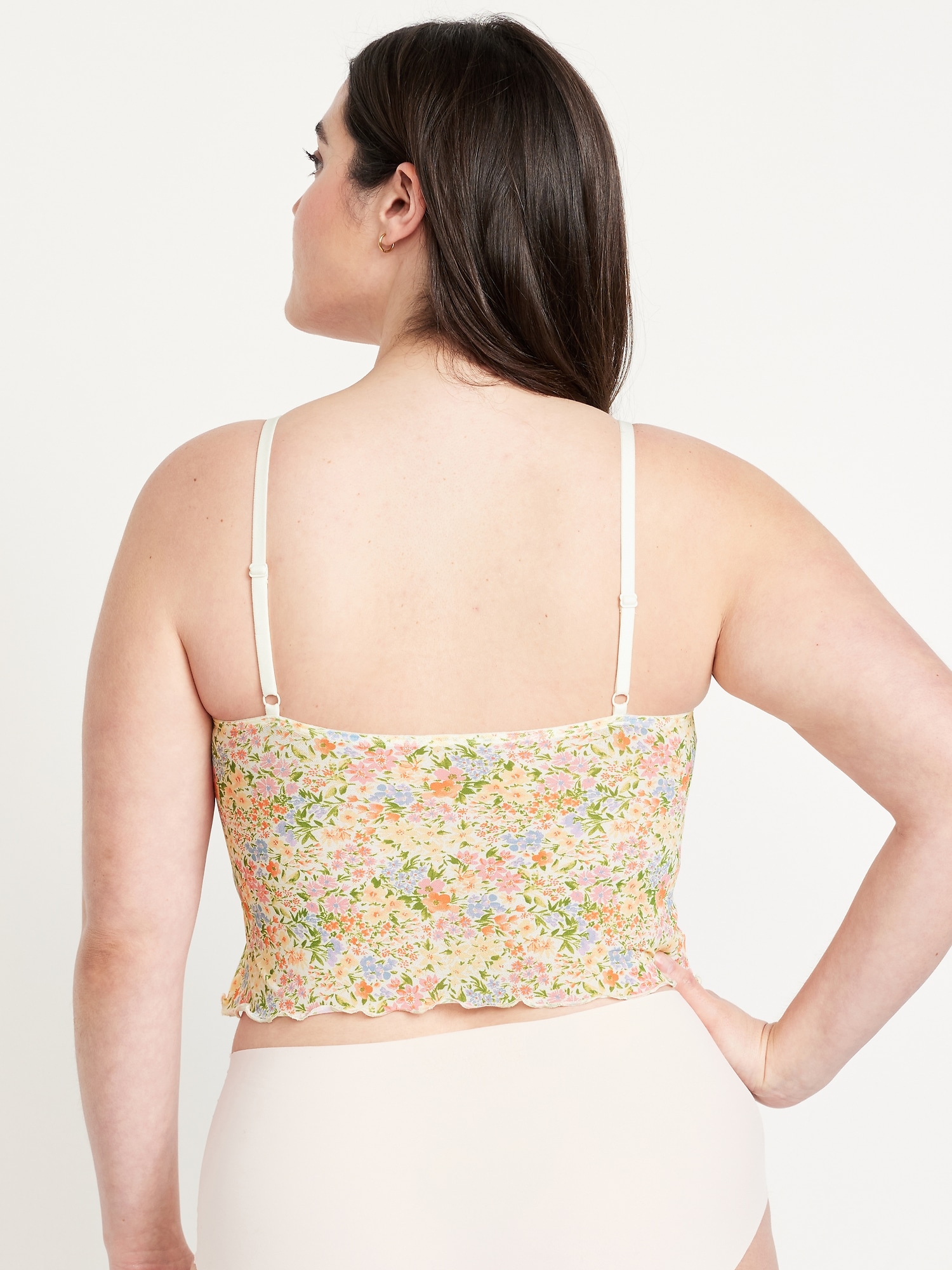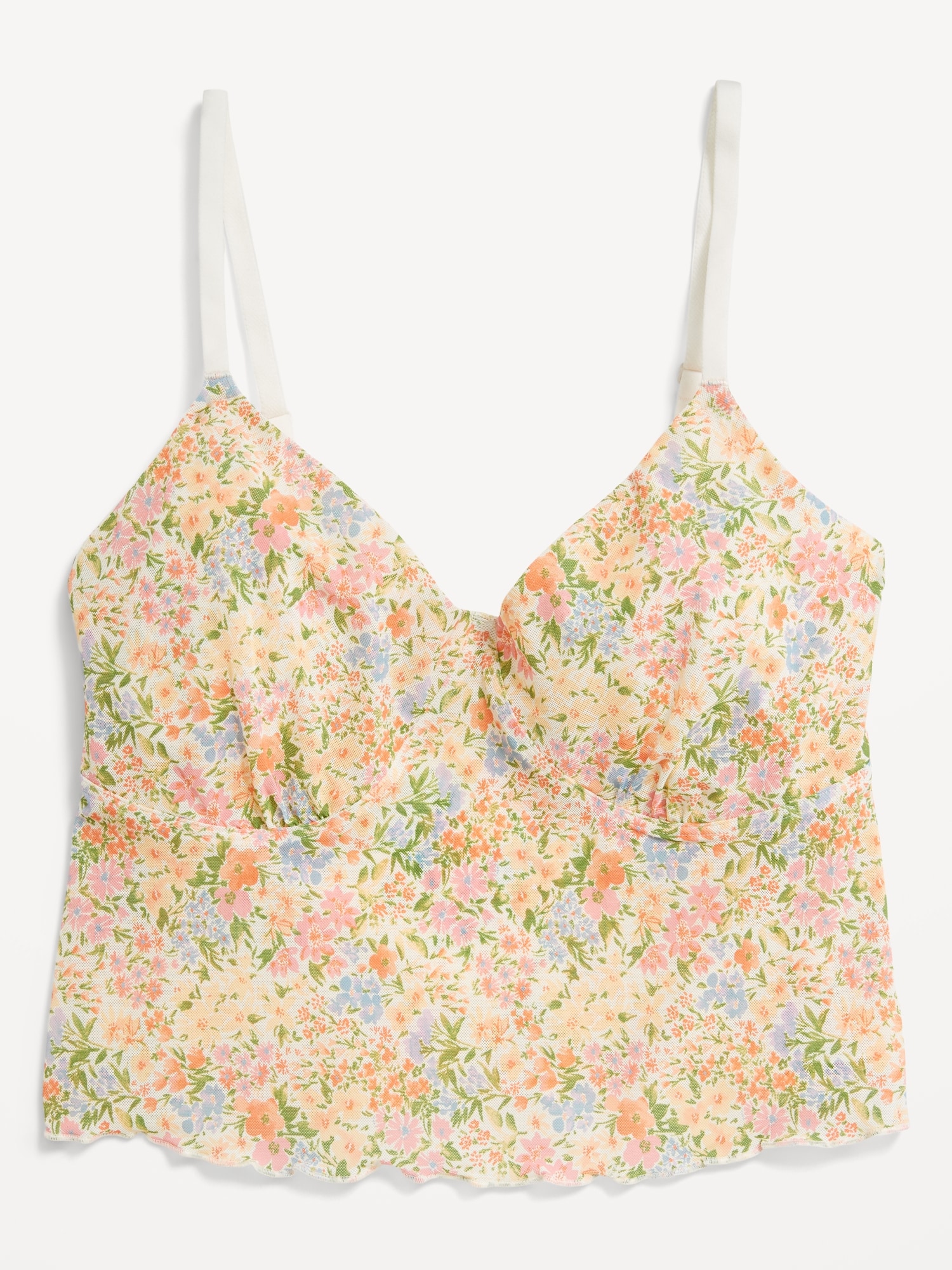 Mesh Cami Lounge Top: scoop neck, adjustable straps, ruffled hem, seamed shirred cups, #687043