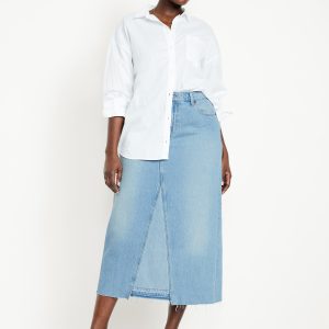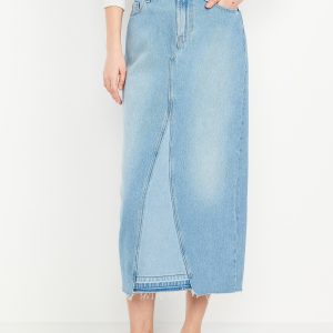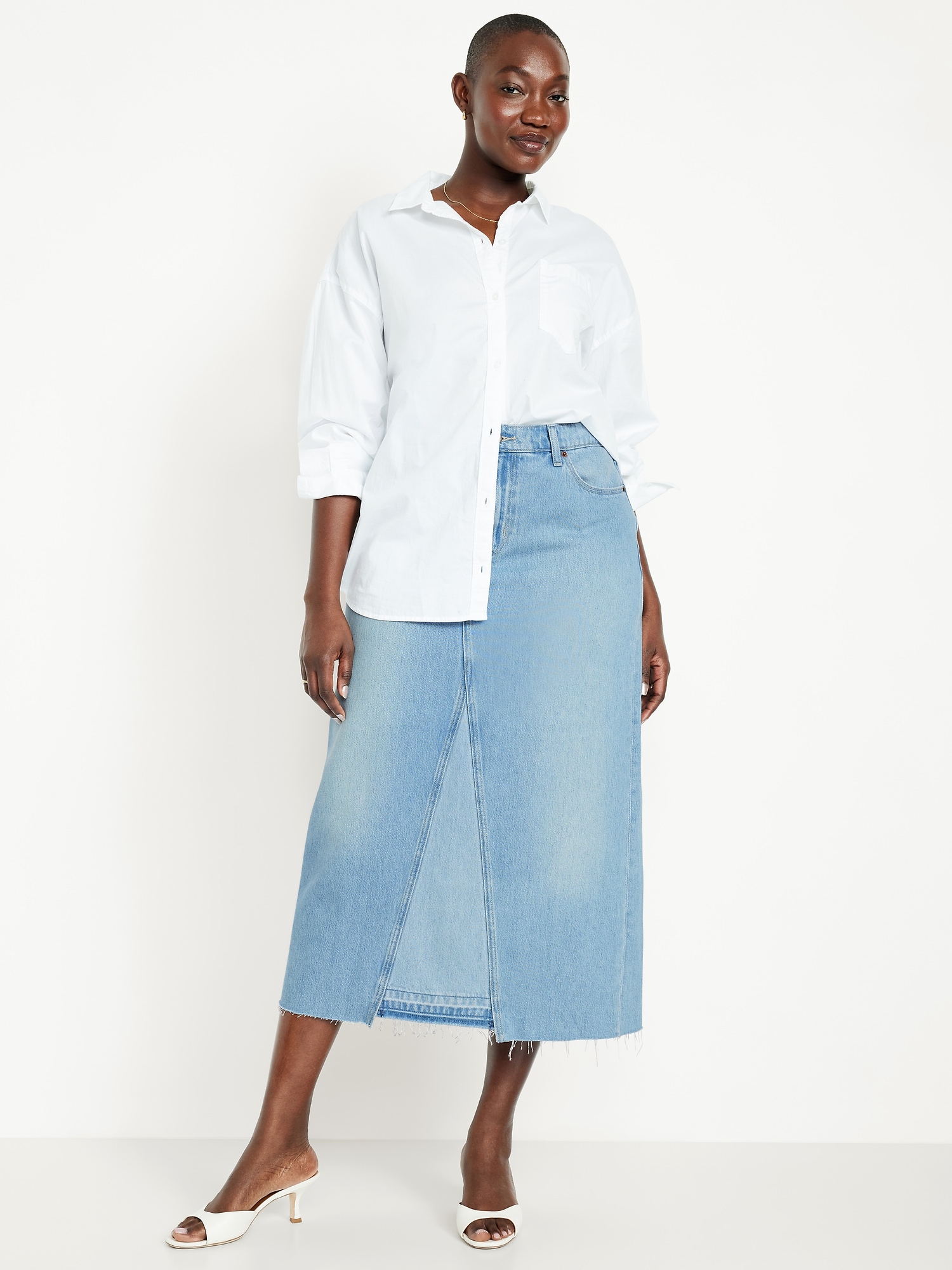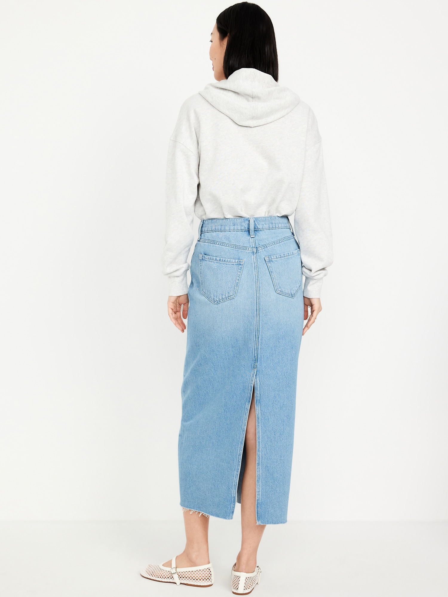 Mid-Rise Jean Maxi Skirt: zip fly, front scoop pockets, back patch pockets, front center slit, maxi length, #659674