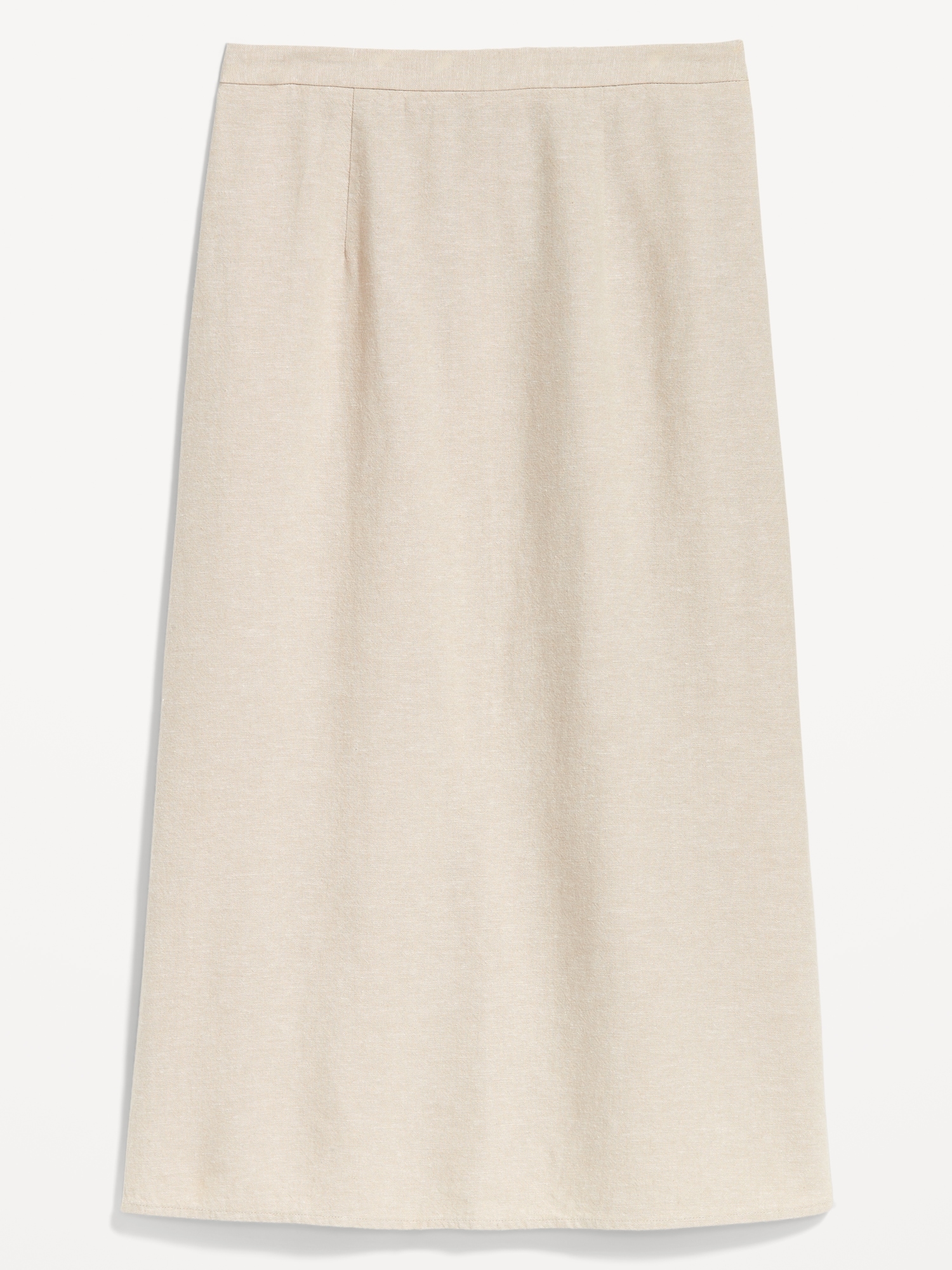 Mid-Rise Linen-Blend Midi Skirt: elasticized back waist, hidden left side zipper, side slits, easy pull-on style, #705483