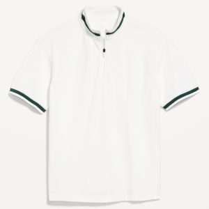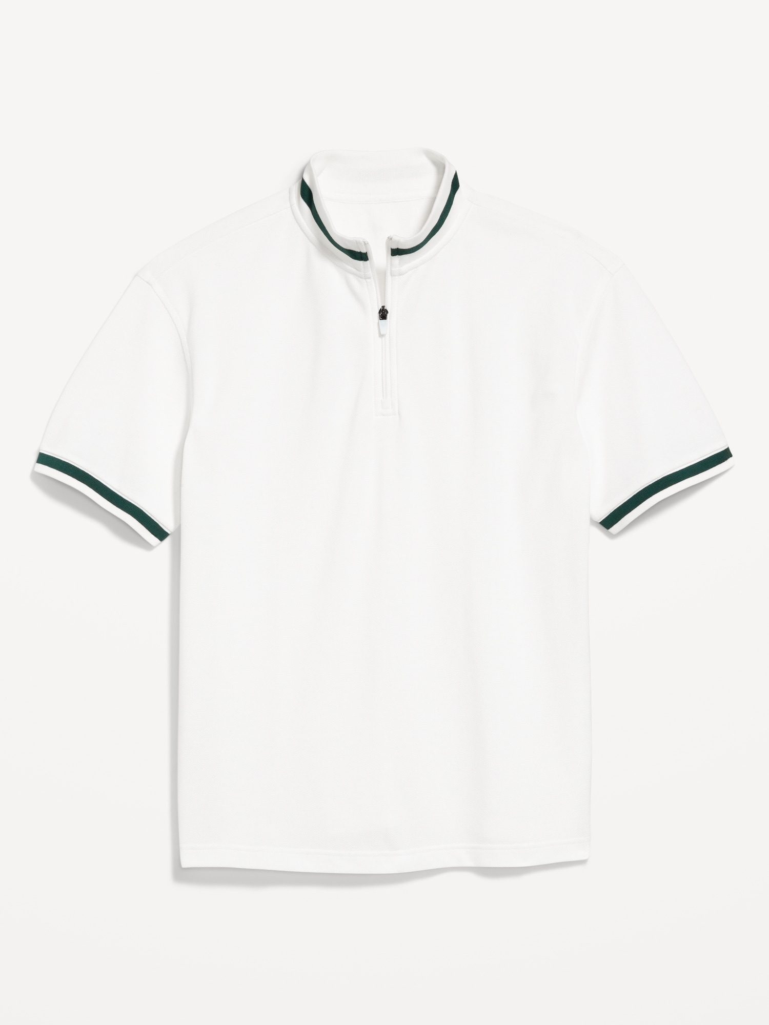 Mock-Neck Pique Quarter Zip: quarter-zip mock neck, short sleeves, contrasting stripes at neck and cuffs, #762331
