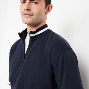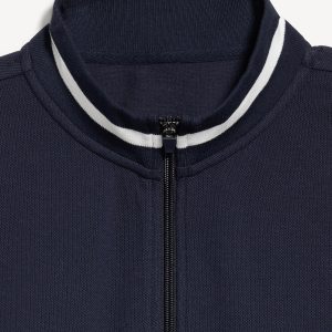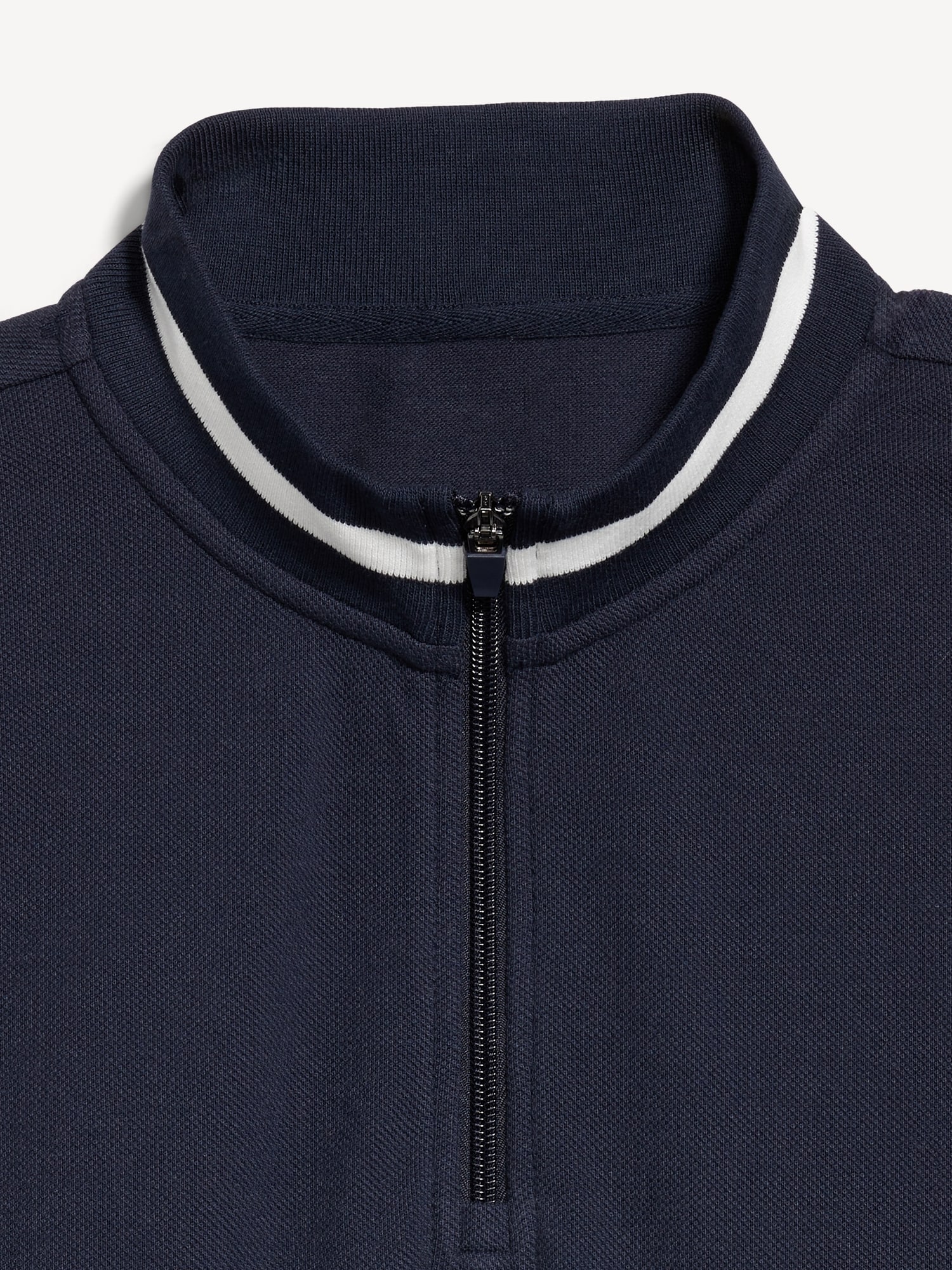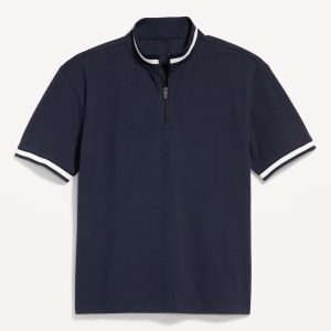 Mock-Neck Pique Quarter Zip: quarter-zip mock neck, short sleeves, contrasting stripes at neck and cuffs, #762331