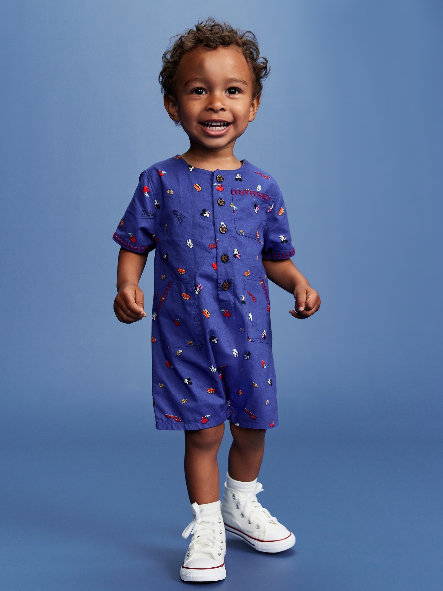 Old Navy x Disney© Poplin One-Piece Romper for Baby: Two icons, together at last. Browse the collection for the whole fam.rounded neckline, short sleeves, full length button placket, patch pocket at chest, diagonal utility pockets, hidden snaps at inseam, licensed graphic, ©Disney., #762099