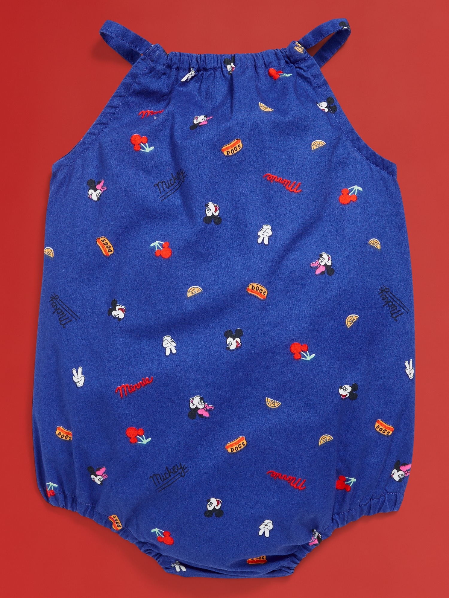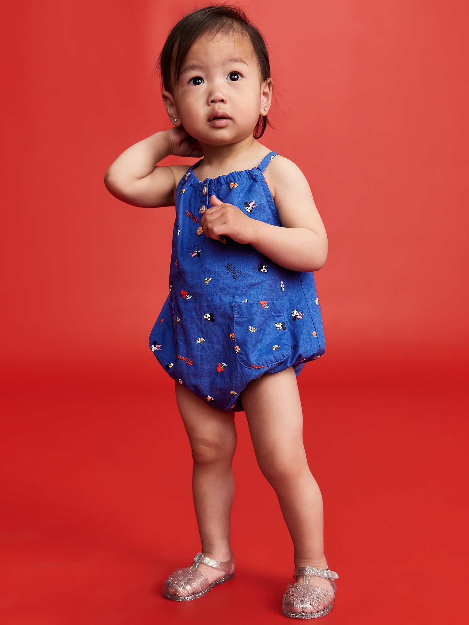 Old Navy x Disney© Sleeveless Henley One-Piece Graphic Romper for Baby: Two icons, together at last. Family matching for the crew!cinched round neckline, three-button henley placket, sleeveless, elasticized bubble leg openings, hidden snaps along inseam, licensed graphic, Disney©, #761818