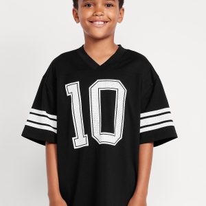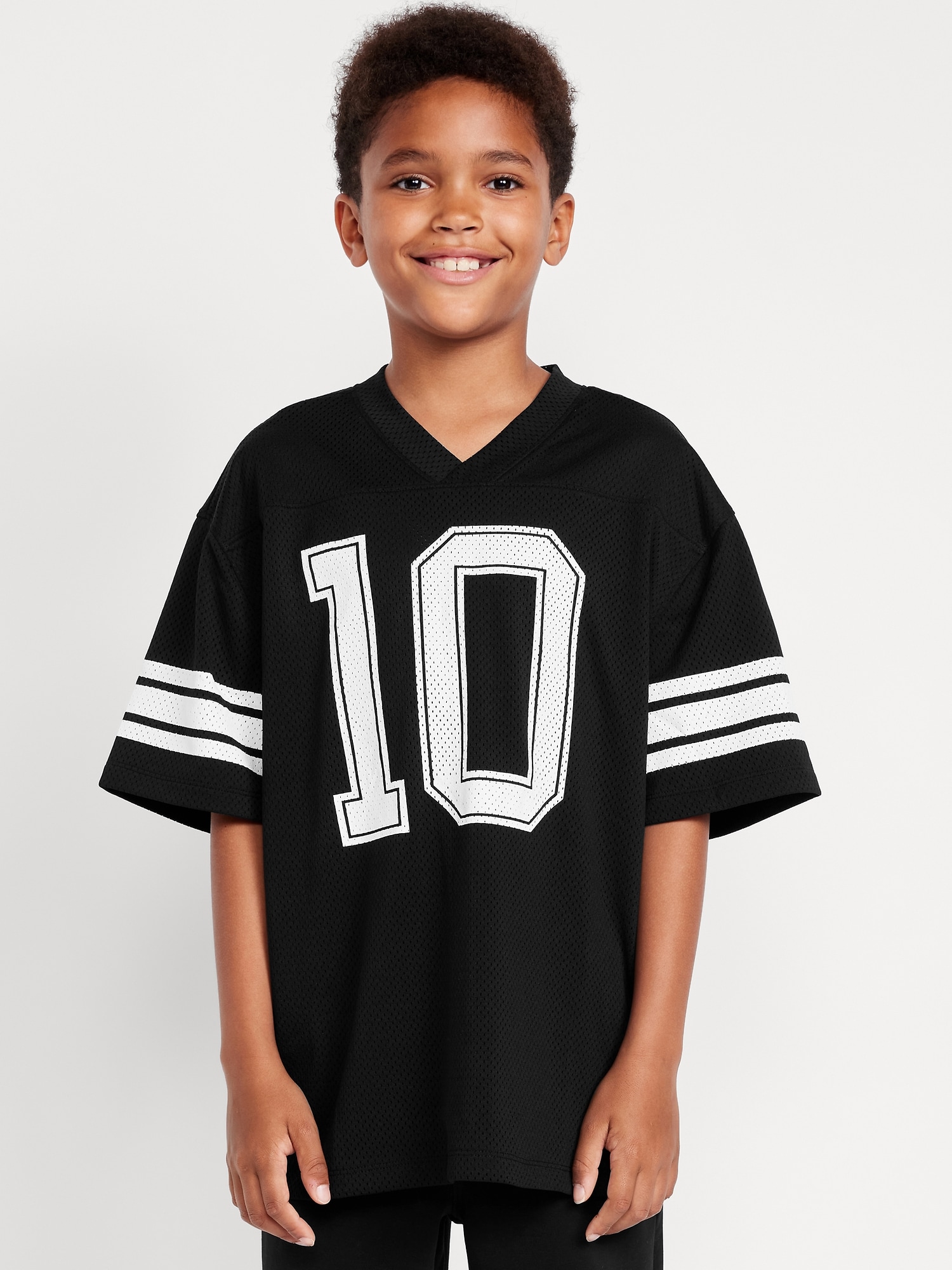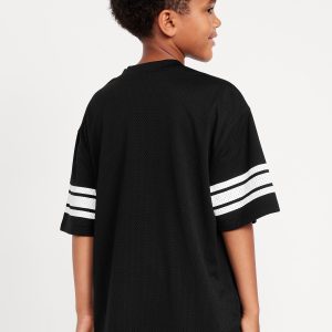 Oversized Boxy Mesh Graphic T-Shirt for Boys: v neck, short sleeves, drop shoulders, stripes at sleeves, graphic at front, #761889