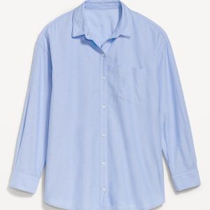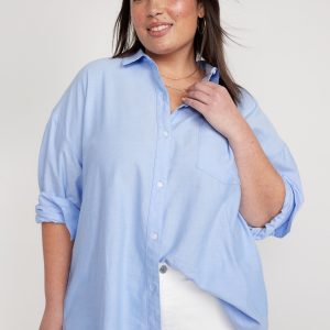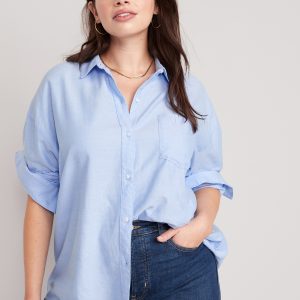 Oversized Button-Down Boyfriend Shirt: spread collar, long sleeves with buttoned cuffs, full-button front, patch chest pocket, curved hem, vertical stripes, #798437