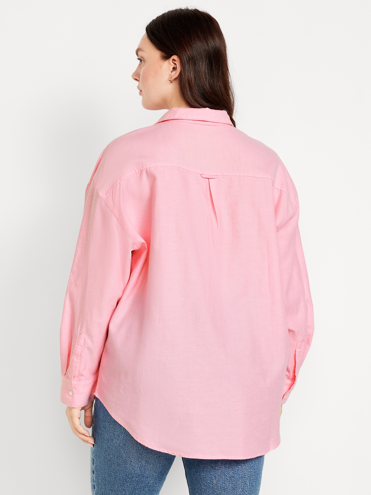 Oversized Button-Down Boyfriend Shirt: spread collar, long sleeves with buttoned cuffs, full-button front, patch chest pocket, curved hem, vertical stripes, #798437