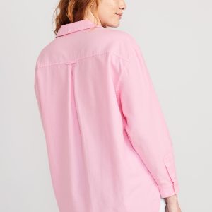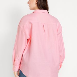 Oversized Button-Down Boyfriend Shirt: spread collar, long sleeves with buttoned cuffs, full-button front, patch chest pocket, curved hem, vertical stripes, #798437