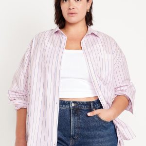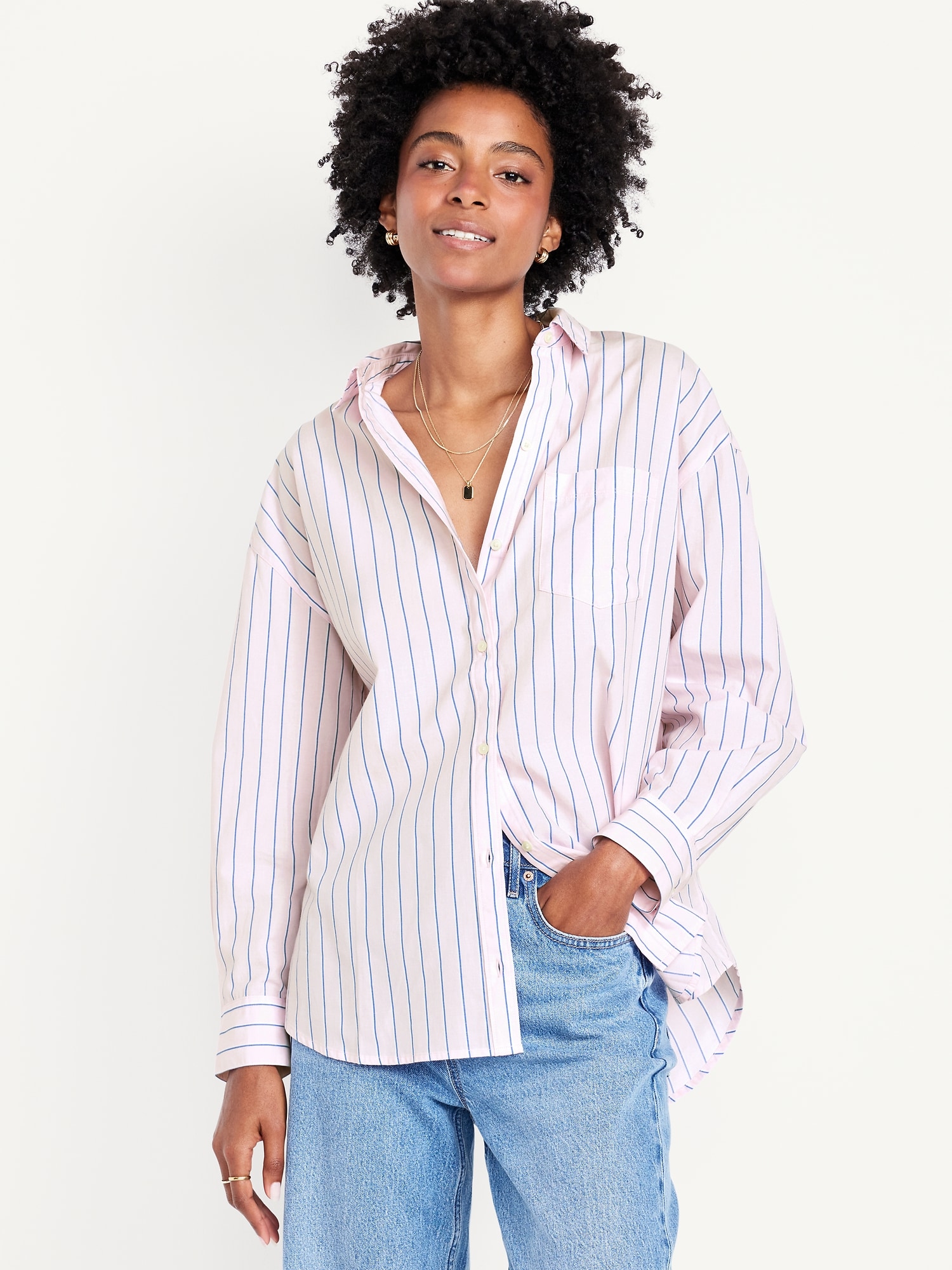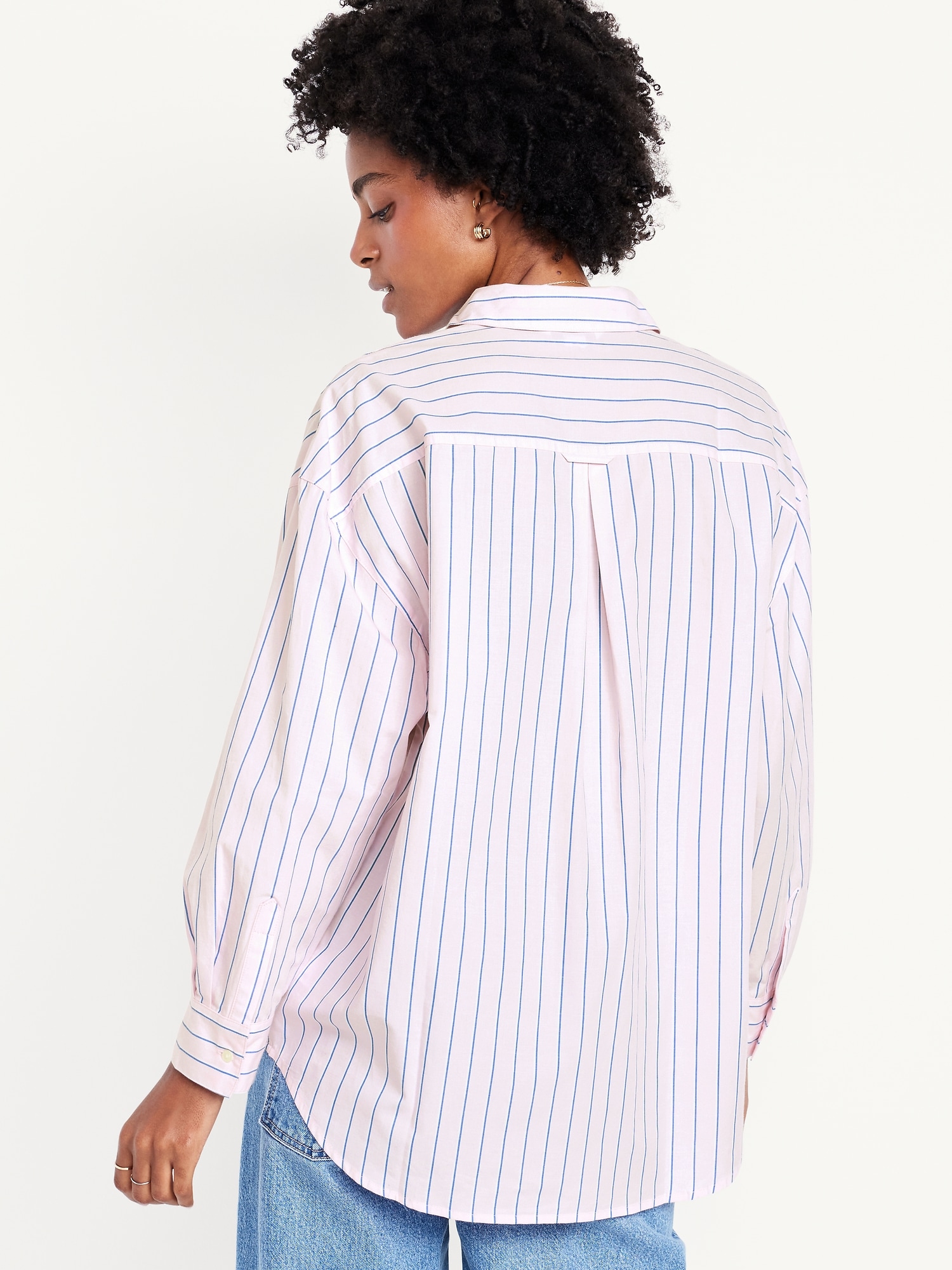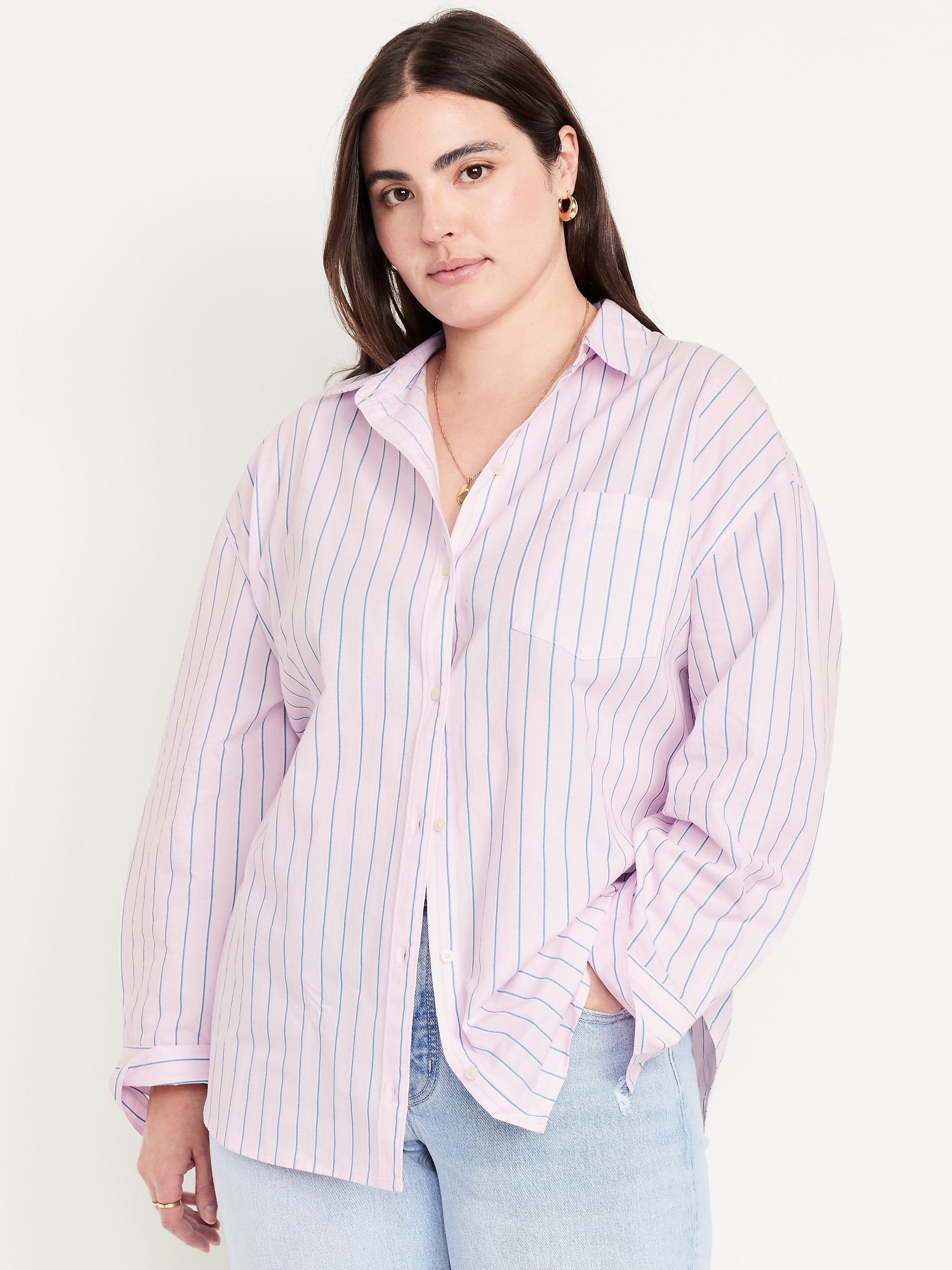 Oversized Button-Down Boyfriend Shirt: spread collar, long sleeves with buttoned cuffs, full-button front, patch chest pocket, curved hem, striped print, #844562