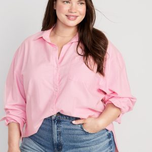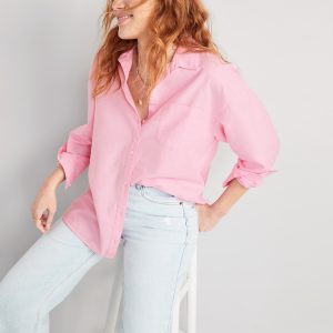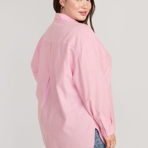 Oversized Button-Down Boyfriend Shirt: spread collar, long sleeves with buttoned cuffs, full-button front, patch chest pocket, curved hem, vertical stripes, #798437