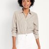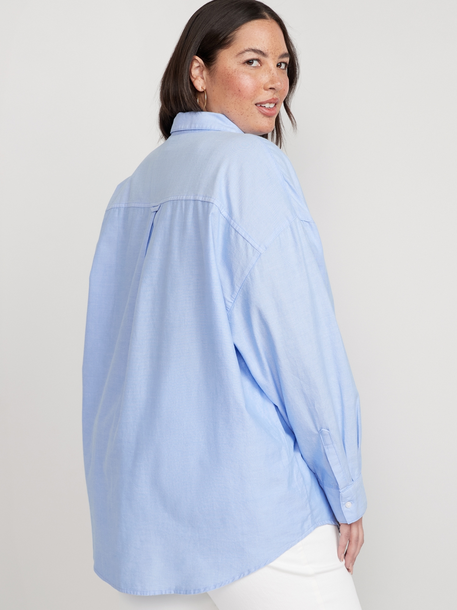Oversized Button-Down Boyfriend Shirt: spread collar, long sleeves with buttoned cuffs, full-button front, patch chest pocket, curved hem, vertical stripes, #798437