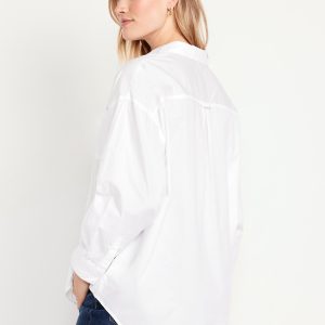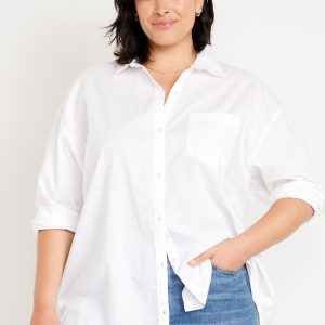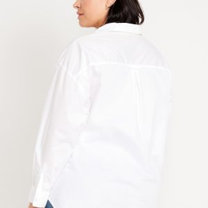 Oversized Button-Down Boyfriend Shirt: spread collar, long sleeves with buttoned cuffs, full-button front, patch chest pocket, curved hem, vertical stripes, #798437