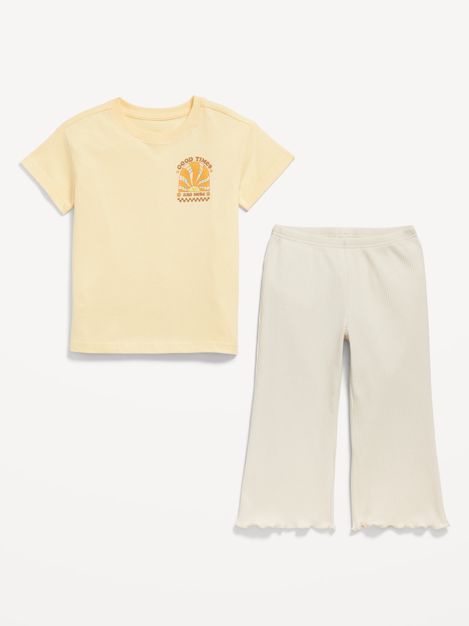 Oversized Graphic T-Shirt and Ribbed Flare Leggings Set for Toddler Girls: crew neck, short sleeves, graphic at front, coordinating leggings, elasticized waistband, lettuce edge hem, #762120