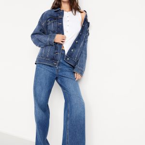 Oversized Jean Trucker Jacket: studded accents, spread collar, long sleeves with buttoned cuffs, full-button front, button-flap chest pockets, vertical welt pockets, #790495