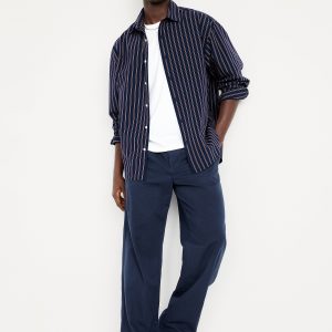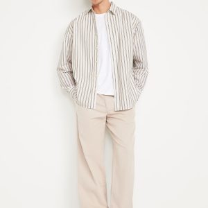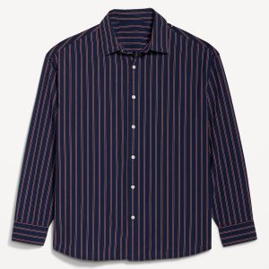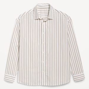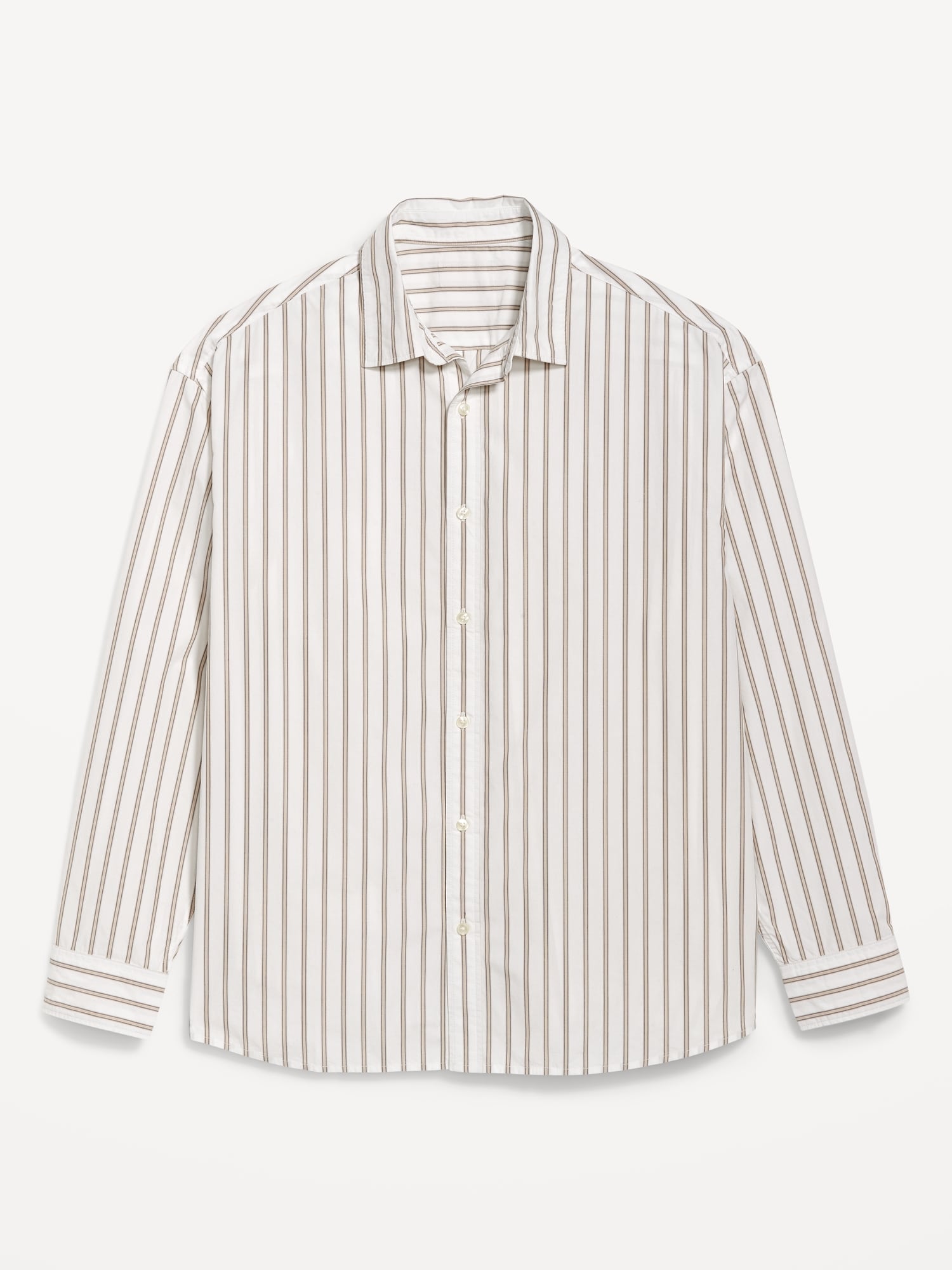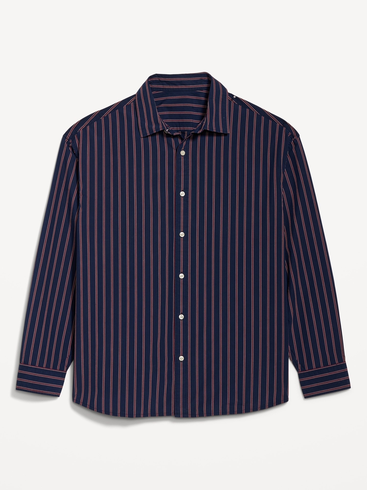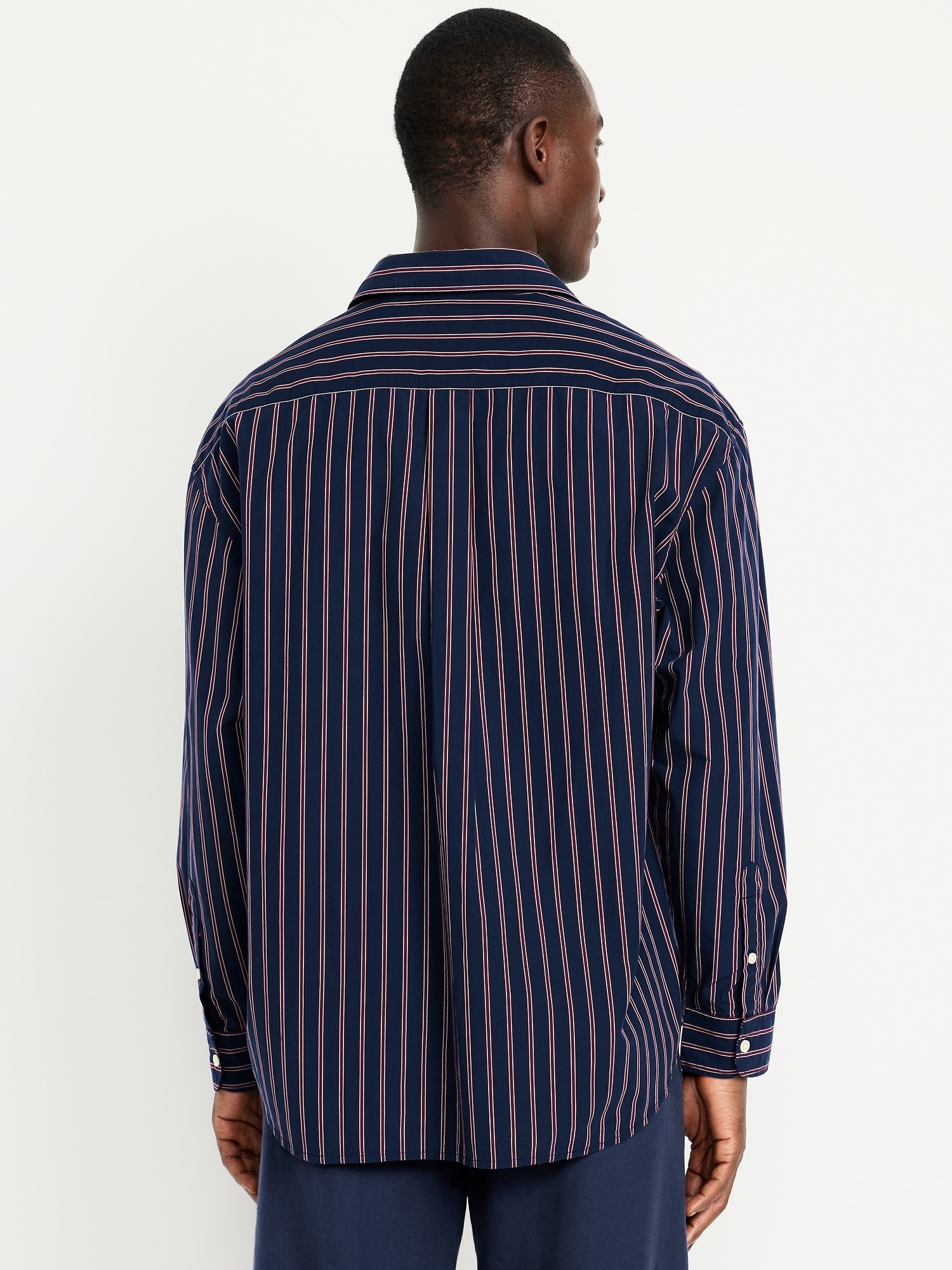 Oversized Poplin Shirt: spread collar, long sleeves, buttoned cuffs, full-button front, striped print, #781618