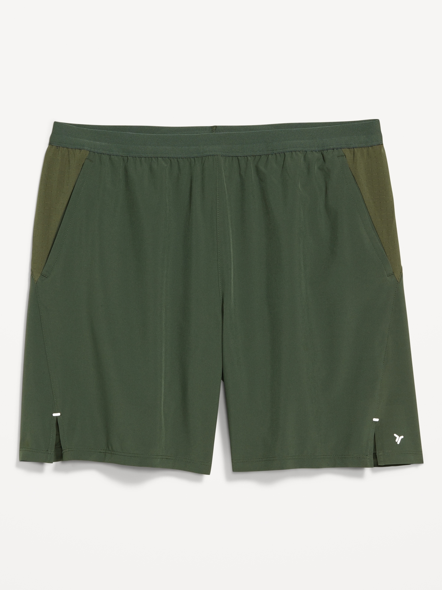 Performance Vent Run Shorts — 7-inch inseam: elastic-drawstring waistband, hidden back pocket at waist, diagonal hip pockets, vented sides, built-in briefs, breathable, quick dry, four-way stretch, #693436