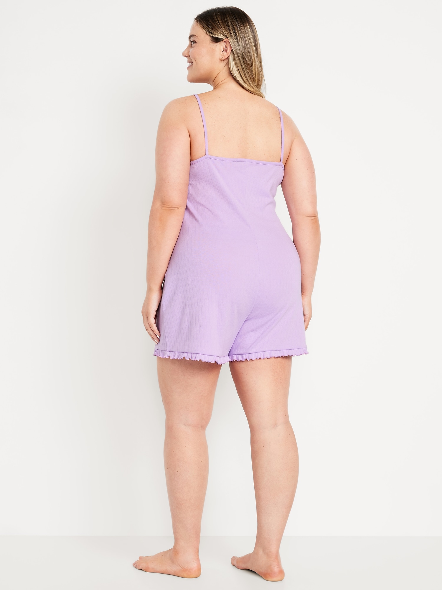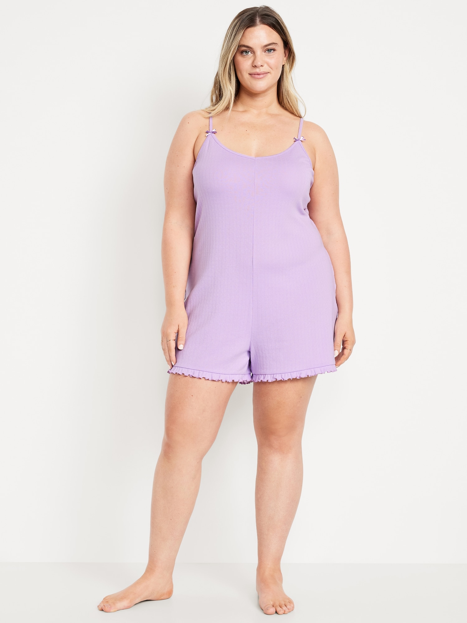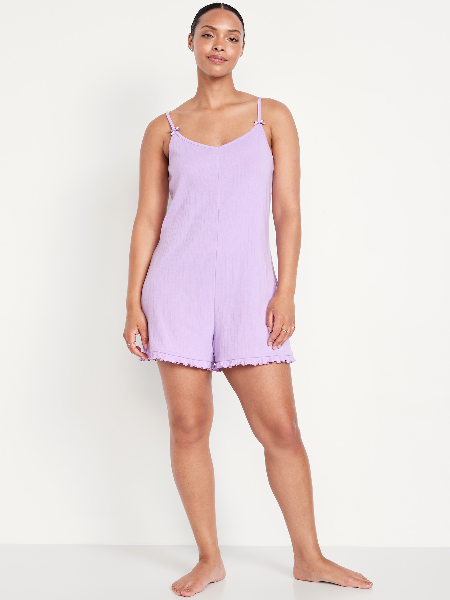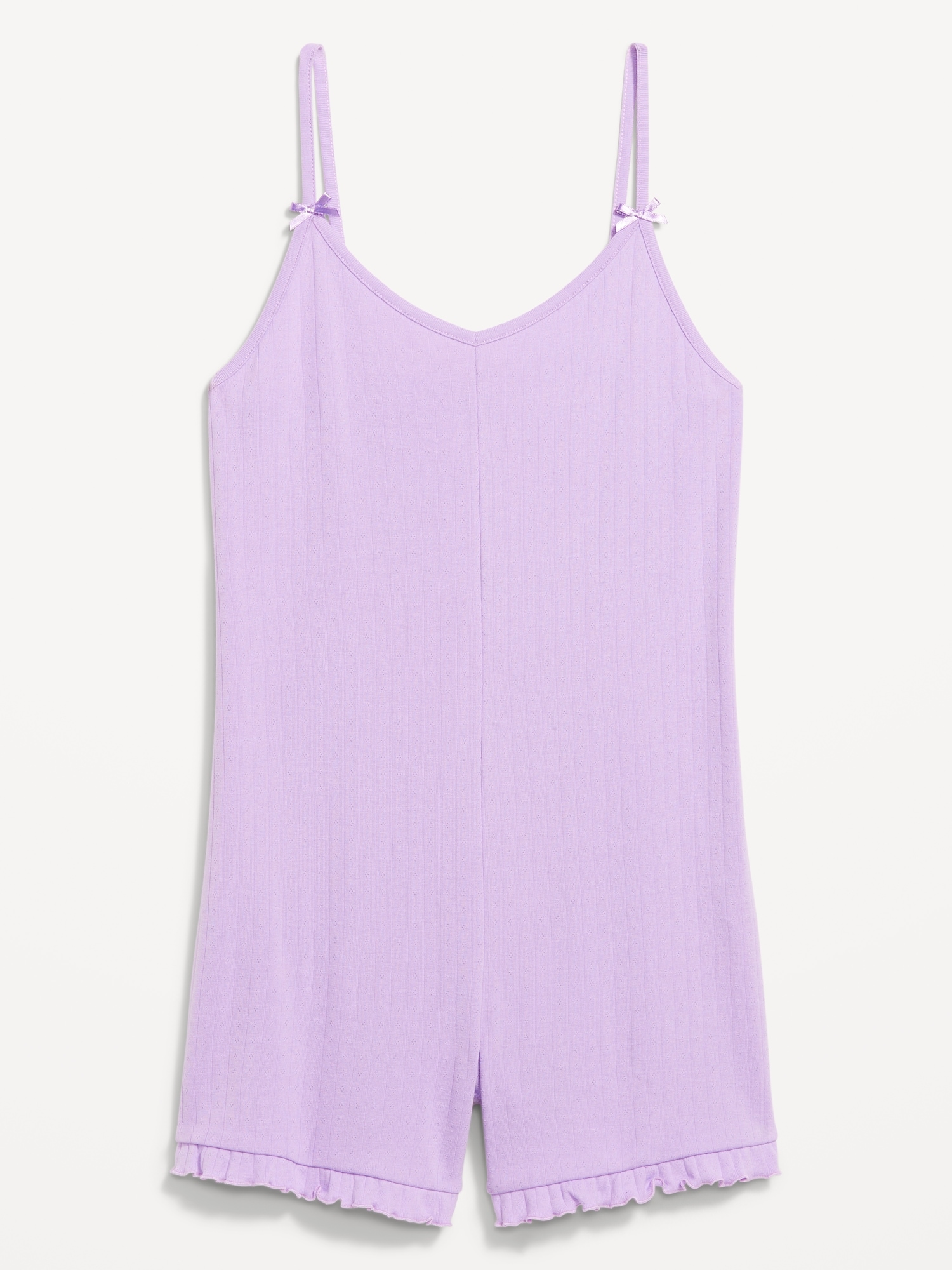 Pointelle Pajama Romper: spaghetti straps with bow accent, v-neck, ruffled hem, #808349